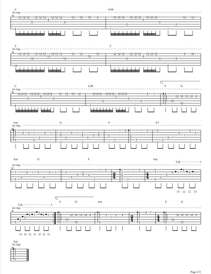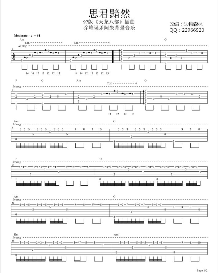 曲谱介绍: 这首曲子采用的是标准调弦,4/4拍的节奏,无需特殊调音。演奏时可不夹变调夹,曲谱由琴谱网更新上传,来源于@失物森林编配出品。这首歌歌曲作为97版《天龙八部》的配乐,配在阿朱之死一节,这里是根据原曲改编而来的指弹吉他版本,曲谱整体难度不算太大。   吉他弹唱演示及视频教学
