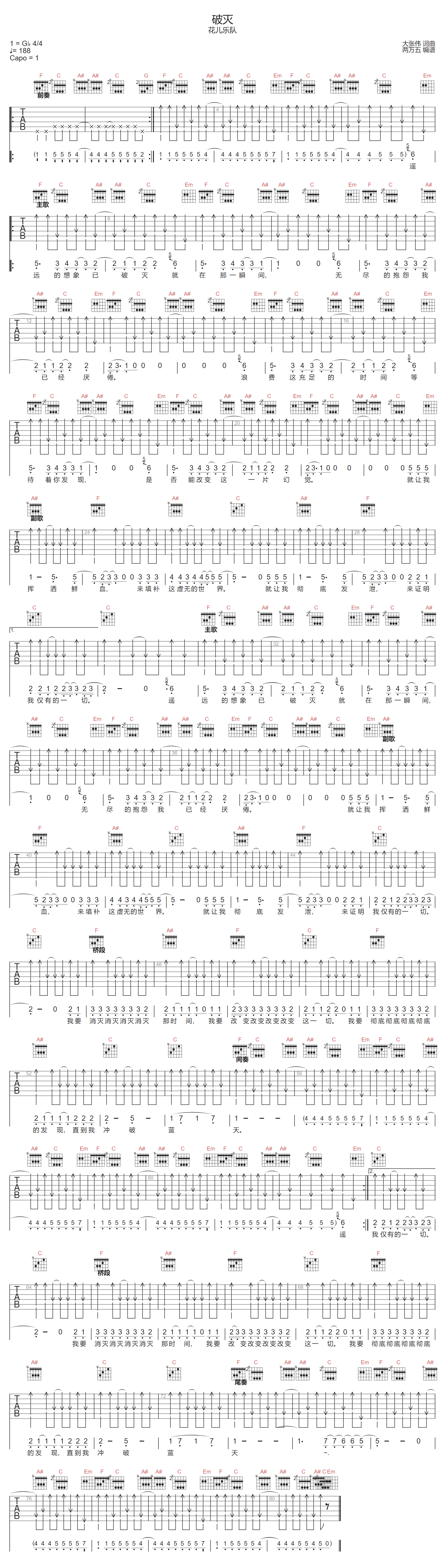 破灭吉他谱 - 花儿乐队 - F调吉他弹唱谱