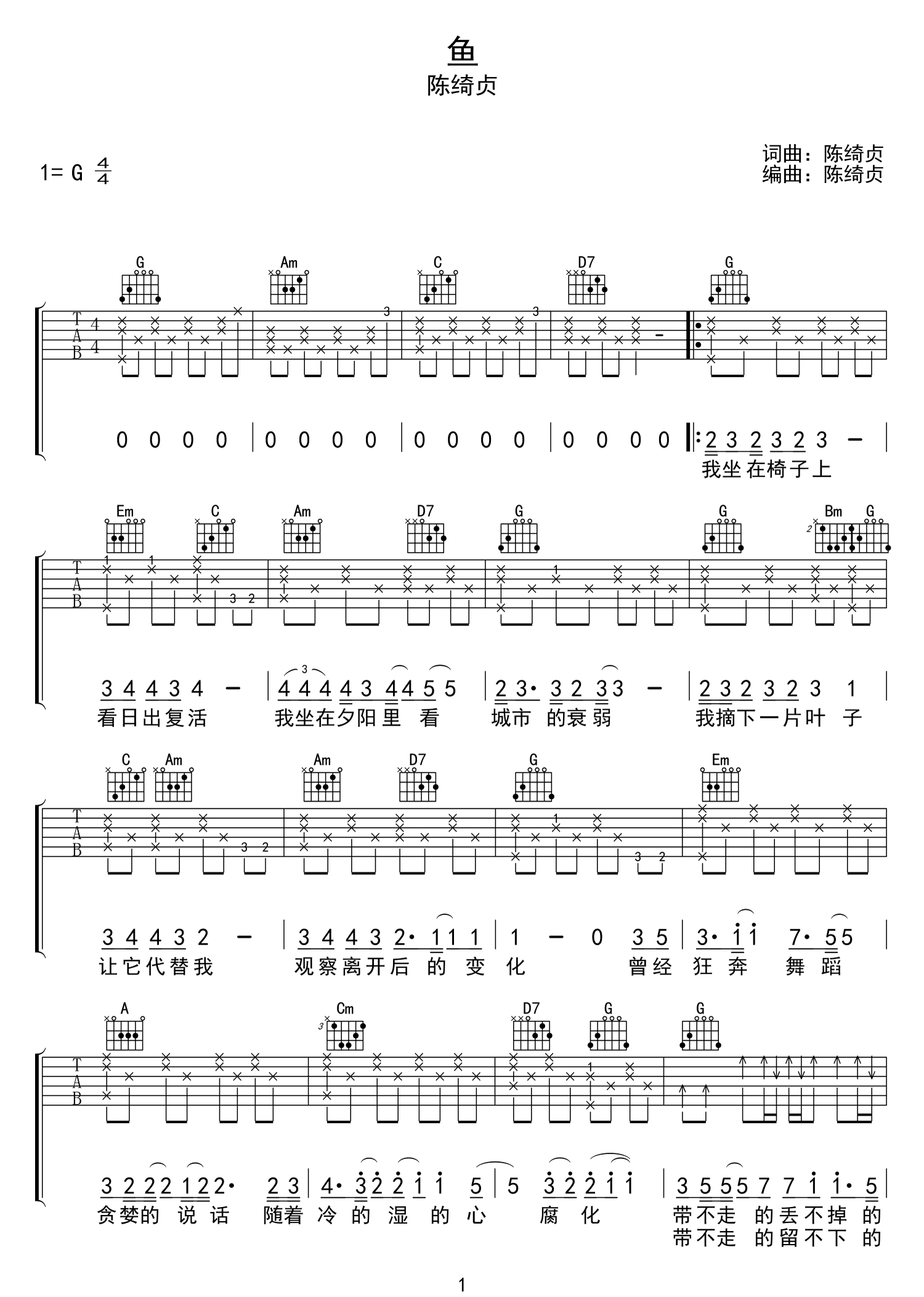 曲谱介绍: 陈绮贞演唱的一首歌曲,4/4拍的节奏,这首歌曲的原调为G调,这里曲谱采用了G调指法进行编配,演唱时可不夹变调夹,曲谱由琴谱网更新上传,曲谱来源于网络转载,编配制谱者暂不详。歌词中并没有出现鱼,但是歌名却是鱼,陈绮贞是学哲学出身,所以歌词不好理解,由于树叶和鱼的形态比较相似,因此这里所说的“鱼”,其实就指的是树叶。