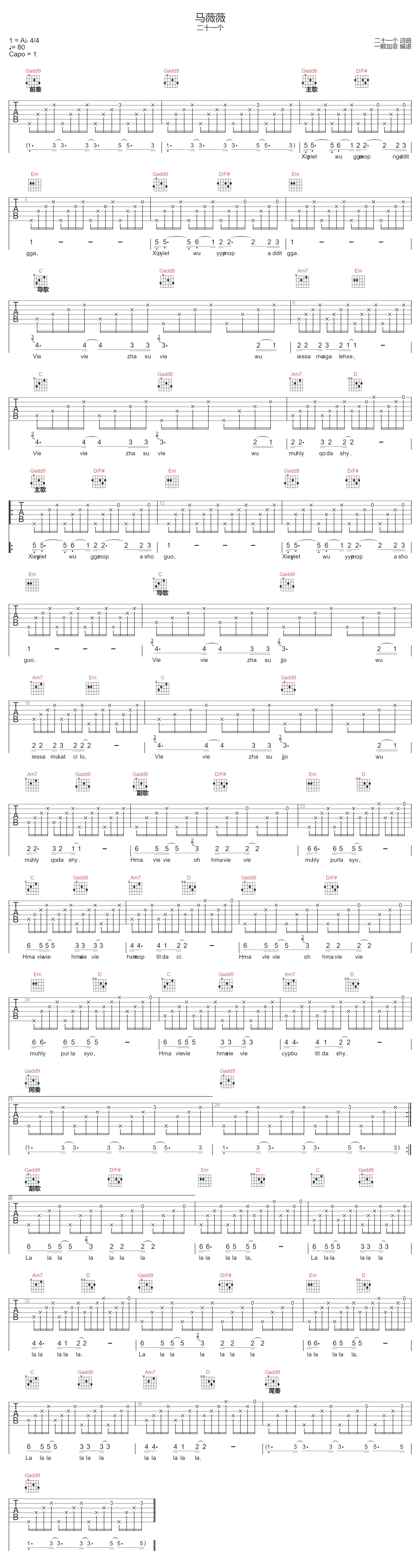 曲谱介绍: 二十一个演唱的一首歌曲,4/4拍的节奏,这首歌曲的原调为降A调,这里曲谱采用了G调指法进行编配,演唱时夹变调夹1品可回到原调,也可根据个人实际嗓音情况选择。曲谱由琴谱网更新上传,来源于@一颗加菲编配出品。这首歌像娓娓道来的故事,那么有好感,抚摸着心灵上的伤痛,给每一位漂泊在外的彝族儿女一种安慰,每一次听都会疯狂心动的程度。