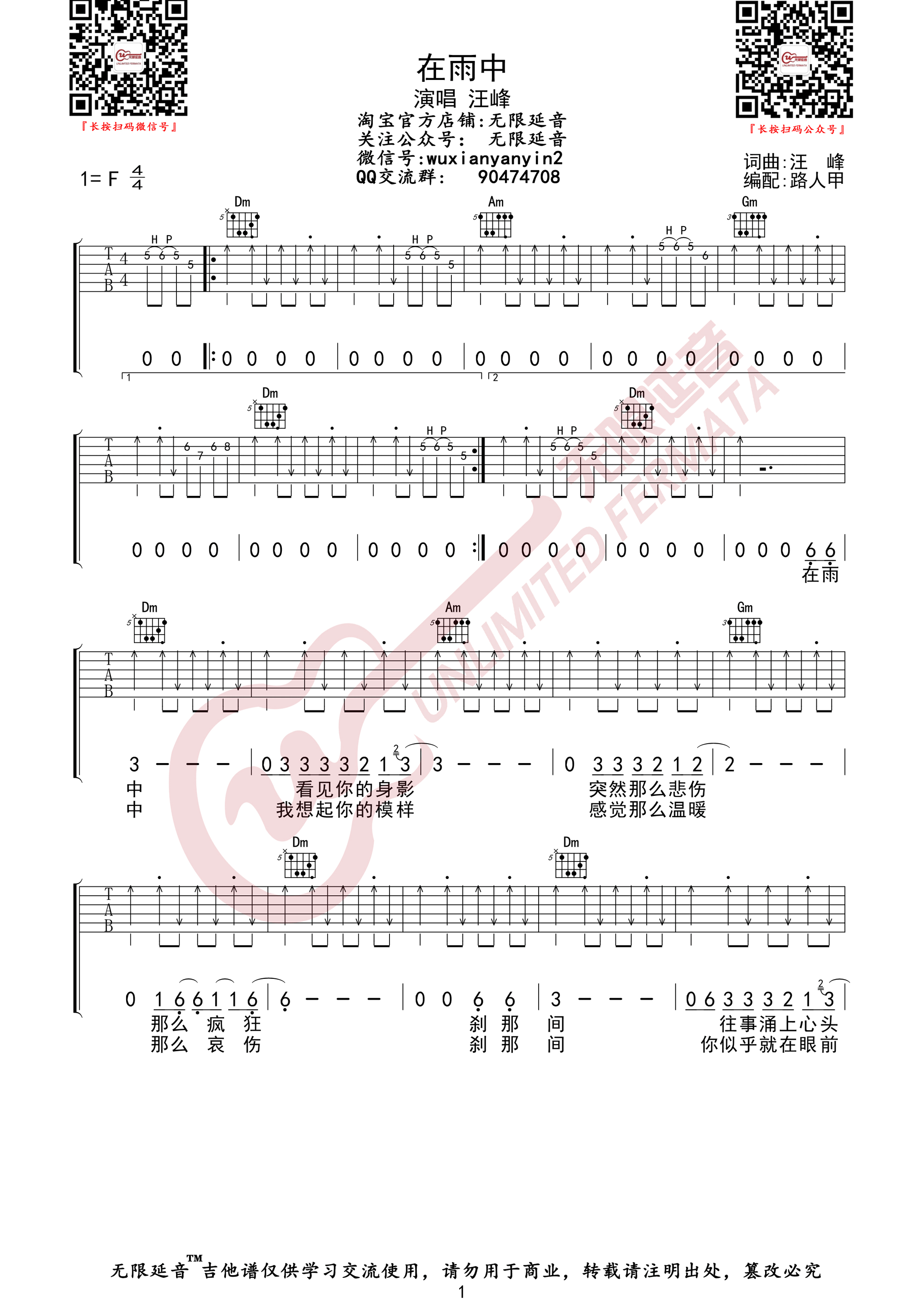 在雨中吉他谱 - 汪峰 - F调吉他弹唱谱