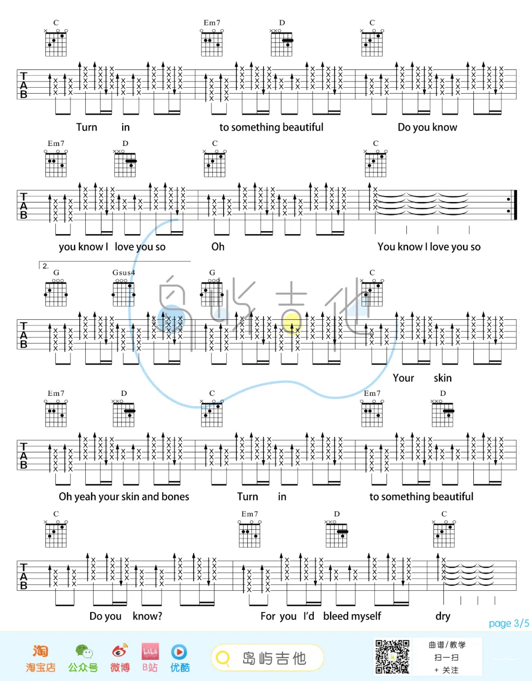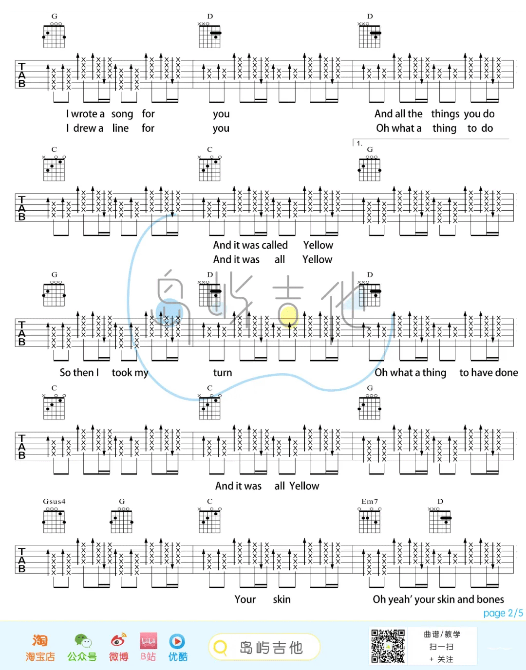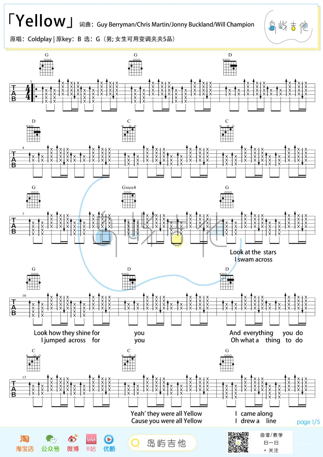 曲谱介绍: Coldplay演唱的一首歌曲,4/4拍的节奏,这首歌曲的原调为B调,这里曲谱采用了G调指法进行编配,演唱时夹变调夹4品可回到原调,也可根据个人实际嗓音情况选择。曲谱由琴谱网更新上传,来源于@岛屿吉他编配出品。那么多的颜色比起来,Yellow是一种比较害羞胆怯的颜色,整首歌就是这样一种想触碰却不敢伸出手的感觉,这个词真是适合到爆。