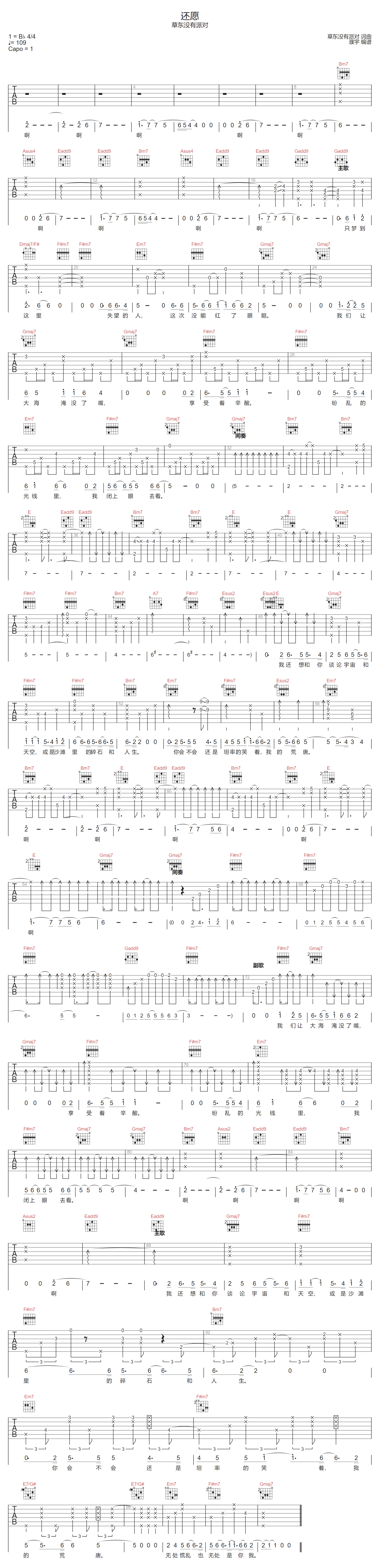 还愿吉他谱 - 草东没有派对 - A调吉他弹唱谱 - 原版