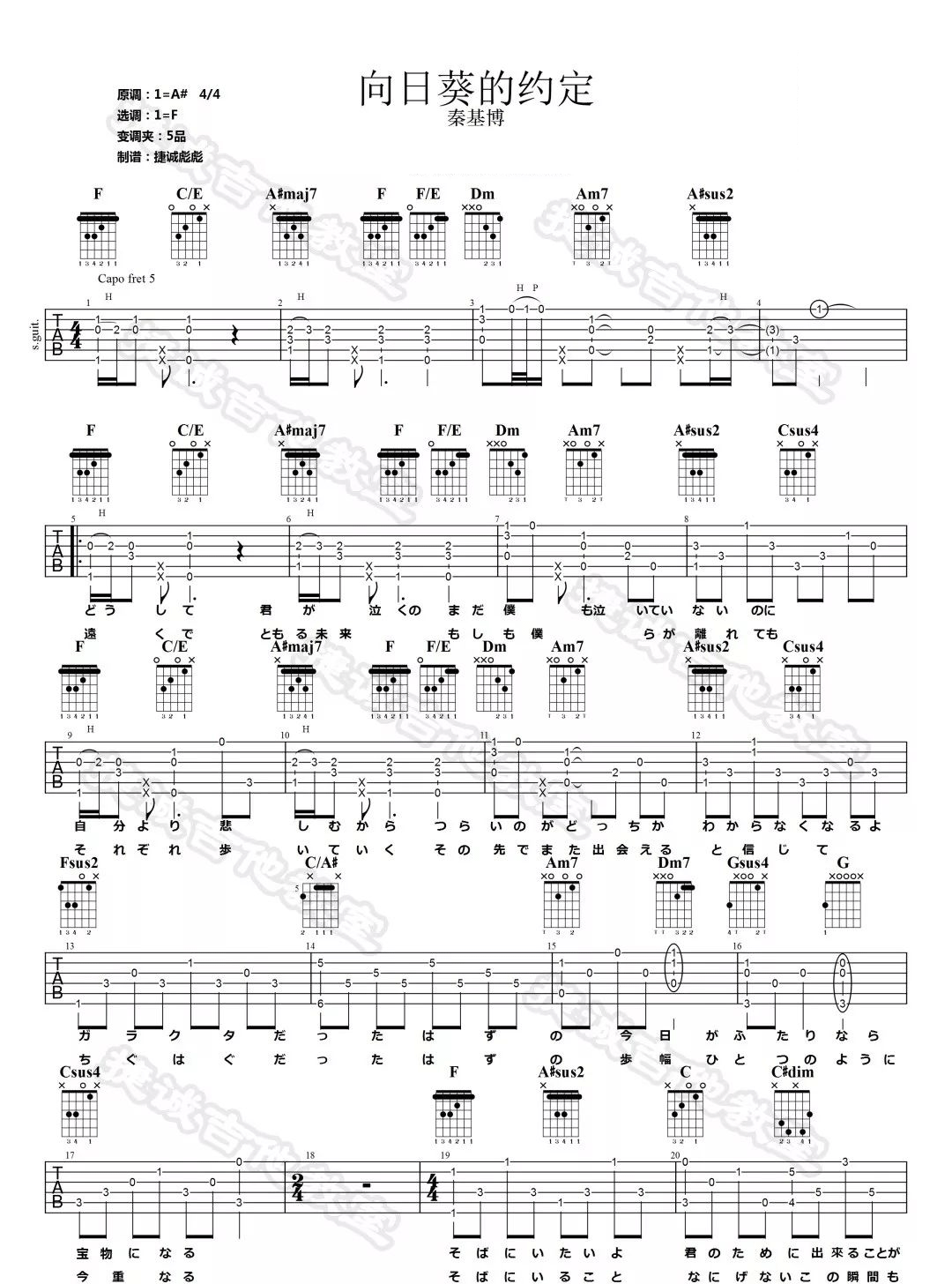 曲谱介绍: 秦基博演唱的一首歌曲,4/4拍的节奏,这首歌曲的原调为降B调,这里曲谱采用了F调指法进行编配,演唱时夹变调夹5品可回到原调,也可根据个人实际嗓音情况选择。曲谱由琴谱网更新上传,来源于@捷诚吉他教室编配出品。这首歌是《哆啦A梦:伴我同行》的主题曲,又名《道别约定》,尾音沙哑而动听,歌词配上电影片段,实在太让人潸然泪下,一首非常好听的日语歌曲。