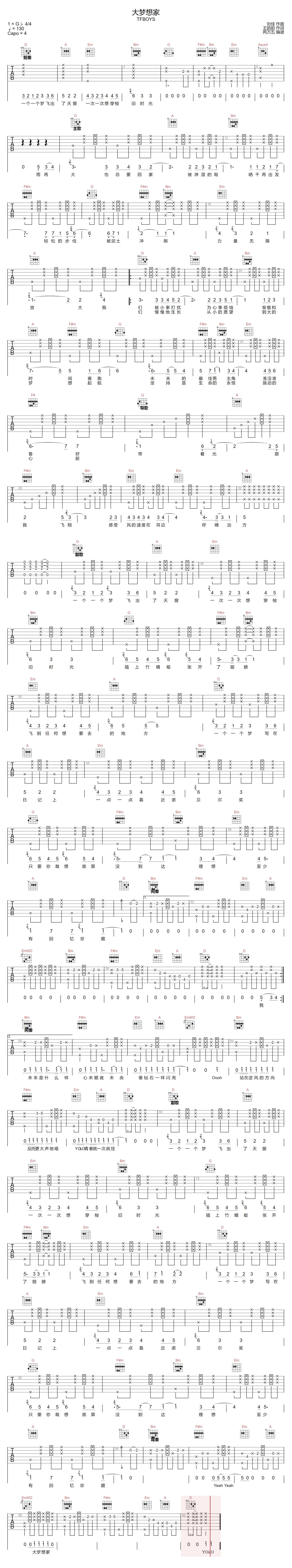 大梦想家吉他谱 - TFBOYS - D调吉他弹唱谱 - 原版
