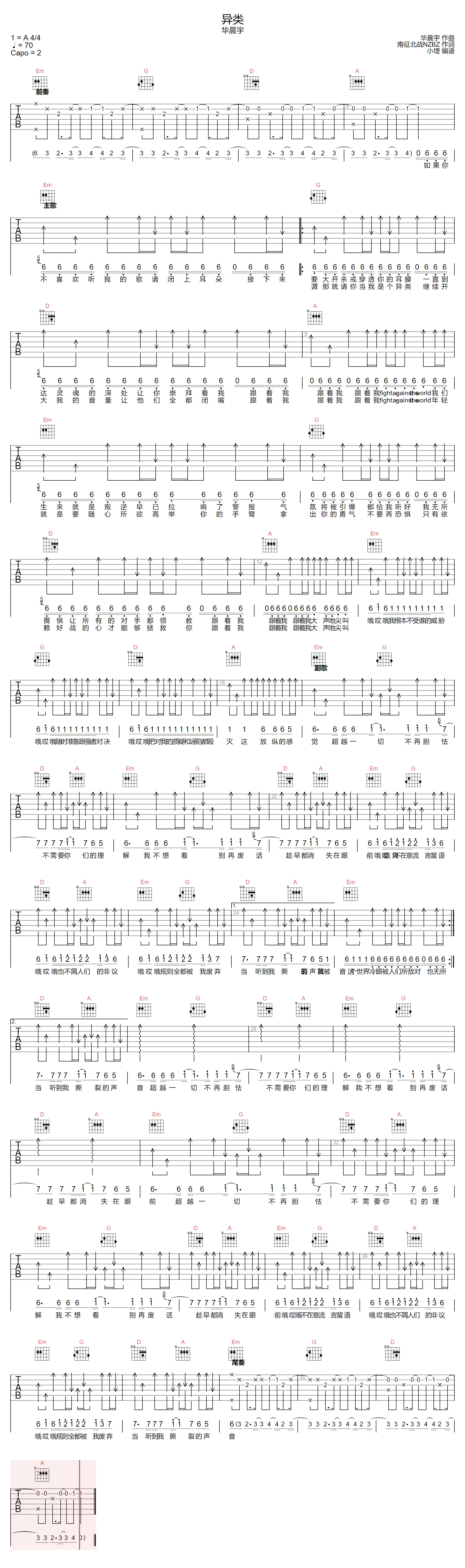 曲谱介绍: 华晨宇演唱的一首歌曲,4/4拍的节奏,这首歌曲的原调为A调,这里曲谱采用了G调指法进行编配,演唱时夹变调夹2品可回到原调,也可根据个人实际嗓音情况选择。曲谱由琴谱网更新上传,来源于@小埋编配出品。歌词起点于桀骜的霸气,核心表达“就算被这个世界冷眼、被人们所敌对,也无所谓,那就请你当我是个异类”,以一个特立独行,霸气横生,不在意别人看法的“异类”来定义华晨宇。