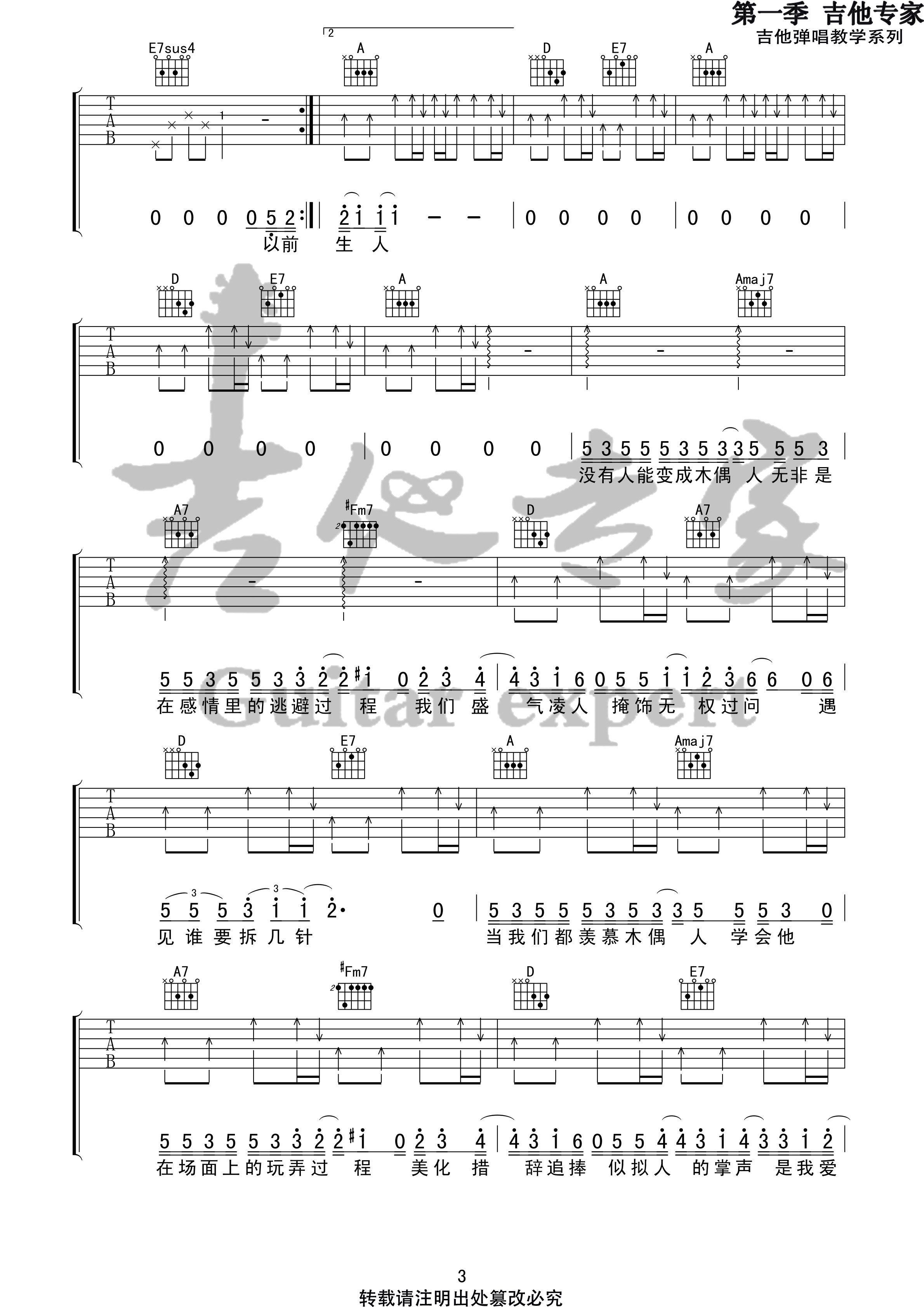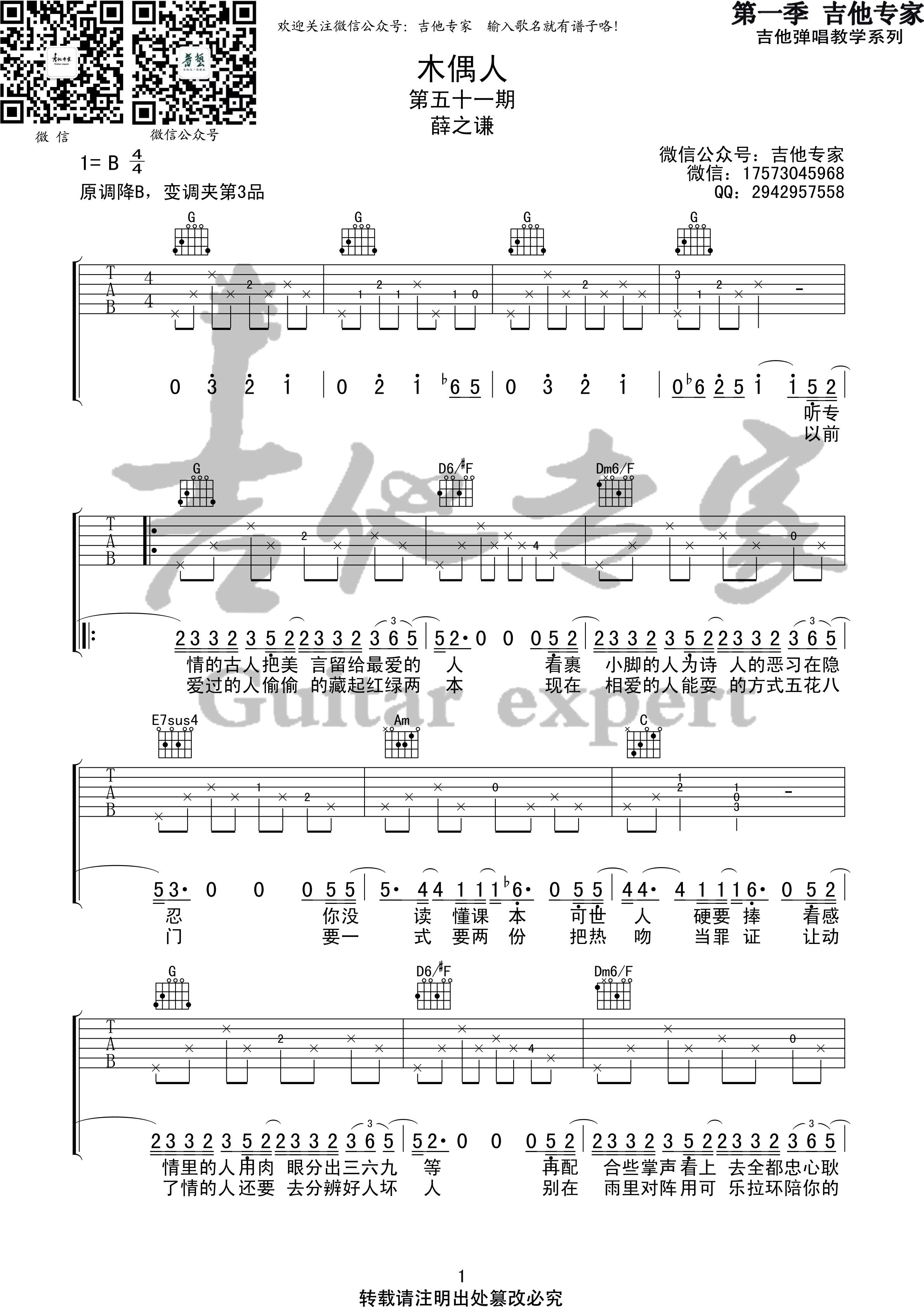 曲谱介绍: 木偶人吉他谱,薛之谦演唱歌曲,G调指法版吉他弹唱谱,来自吉他专家编配六线谱,高清4张图谱。这首歌的编曲很有特色,变音递进很有味道,主歌到副歌部分有转调,为了适合吉他弹唱删减了一些内容。 有多少爱而不得的人, 都沦为被心灵操控的木偶?木偶虽然不会哭,但是也不会孤独。