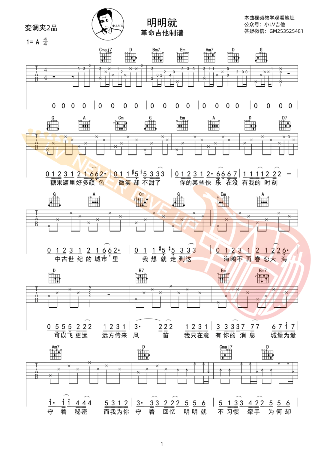 曲谱介绍: 周杰伦演唱的一首歌曲,4/4拍的节奏,这首歌曲的原调为A调,这里曲谱采用了G调指法进行编配,演唱时夹变调夹2品可回到原调,也可根据个人实际嗓音情况选择。曲谱由琴谱网更新上传,来源于@革命吉他编配出品。歌曲中充满欧式风情,歌词吐字清晰,编曲保险顺耳,虽谈不上惊艳,但是周杰伦还是唱出了武侠片的画面感,同步输出了时过境迁和年华老去的情怀。