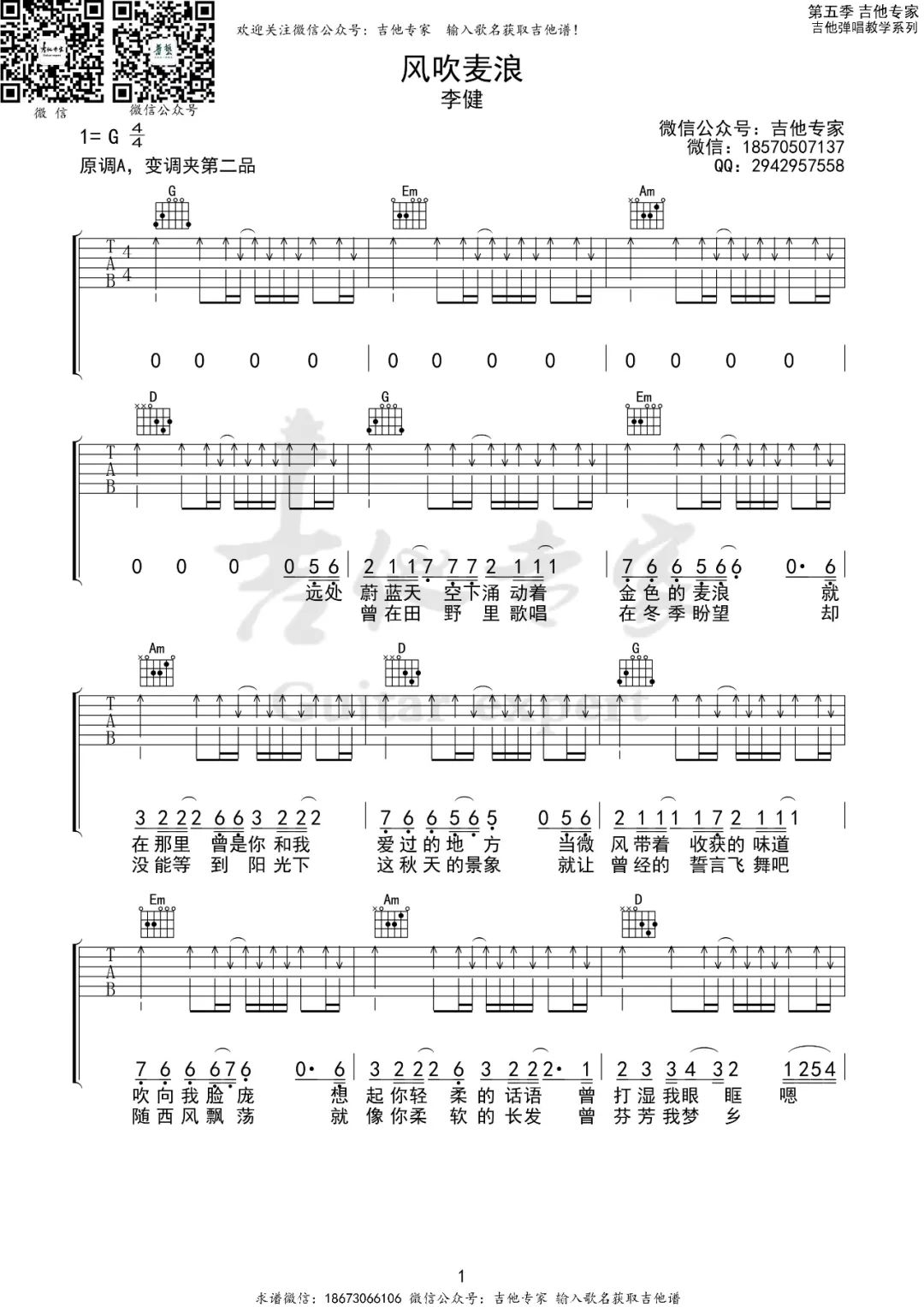 风吹麦浪吉他谱 - 李健 - G调吉他弹唱谱