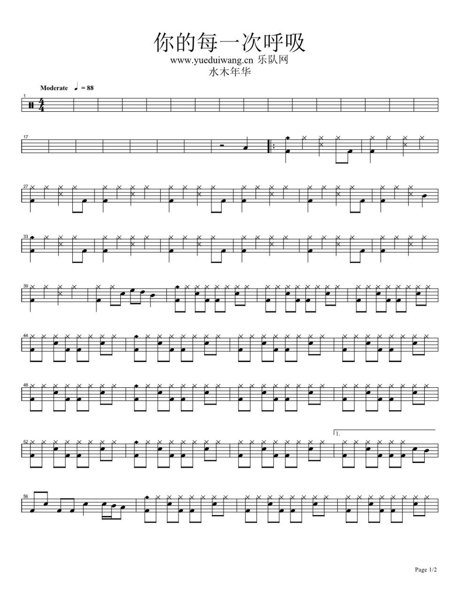 你的每一次呼吸鼓谱 - 水木年华 - 架子鼓谱