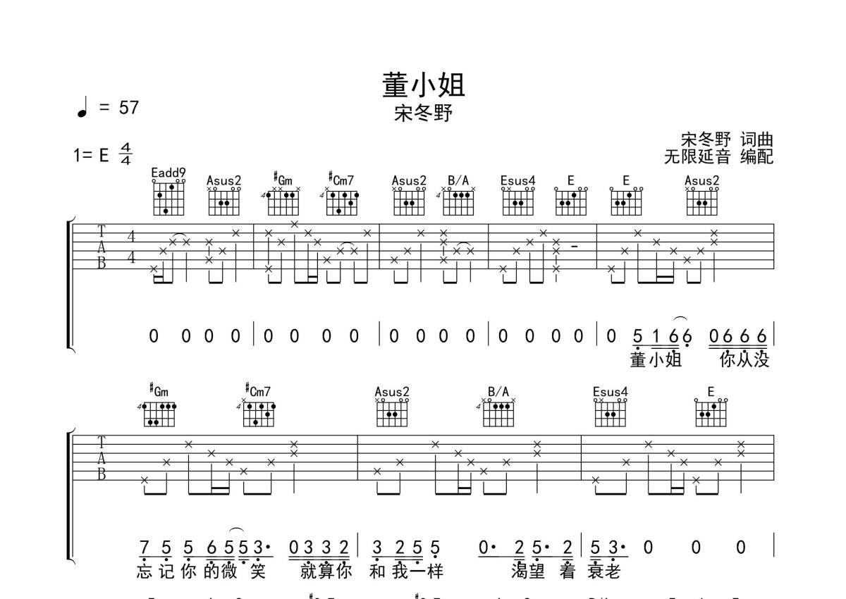 曲谱介绍: 宋冬野《董小姐》吉他弹唱谱,采用E调指法编配,无限延音编配出品,共有3张高清图谱。