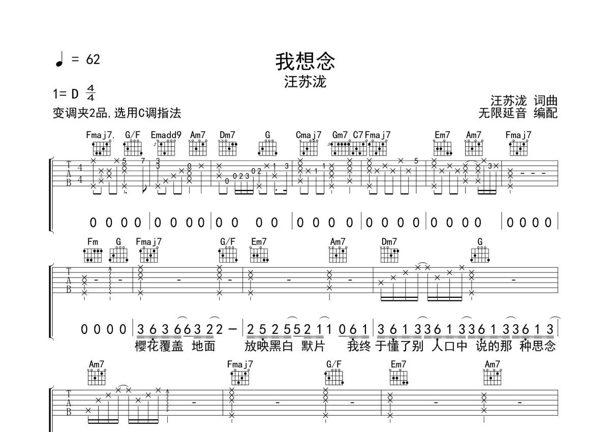 曲谱介绍: 汪苏泷《我想念》吉他弹唱谱,采用C调指法编配,无限延音编配出品,共有3张高清图谱。