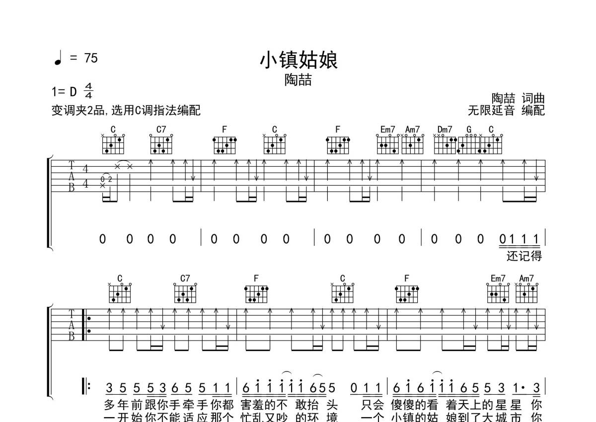 曲谱介绍: 陶喆《小镇姑娘》吉他弹唱谱,采用C调指法编配,无限延音编配出品,共有4张高清图谱。