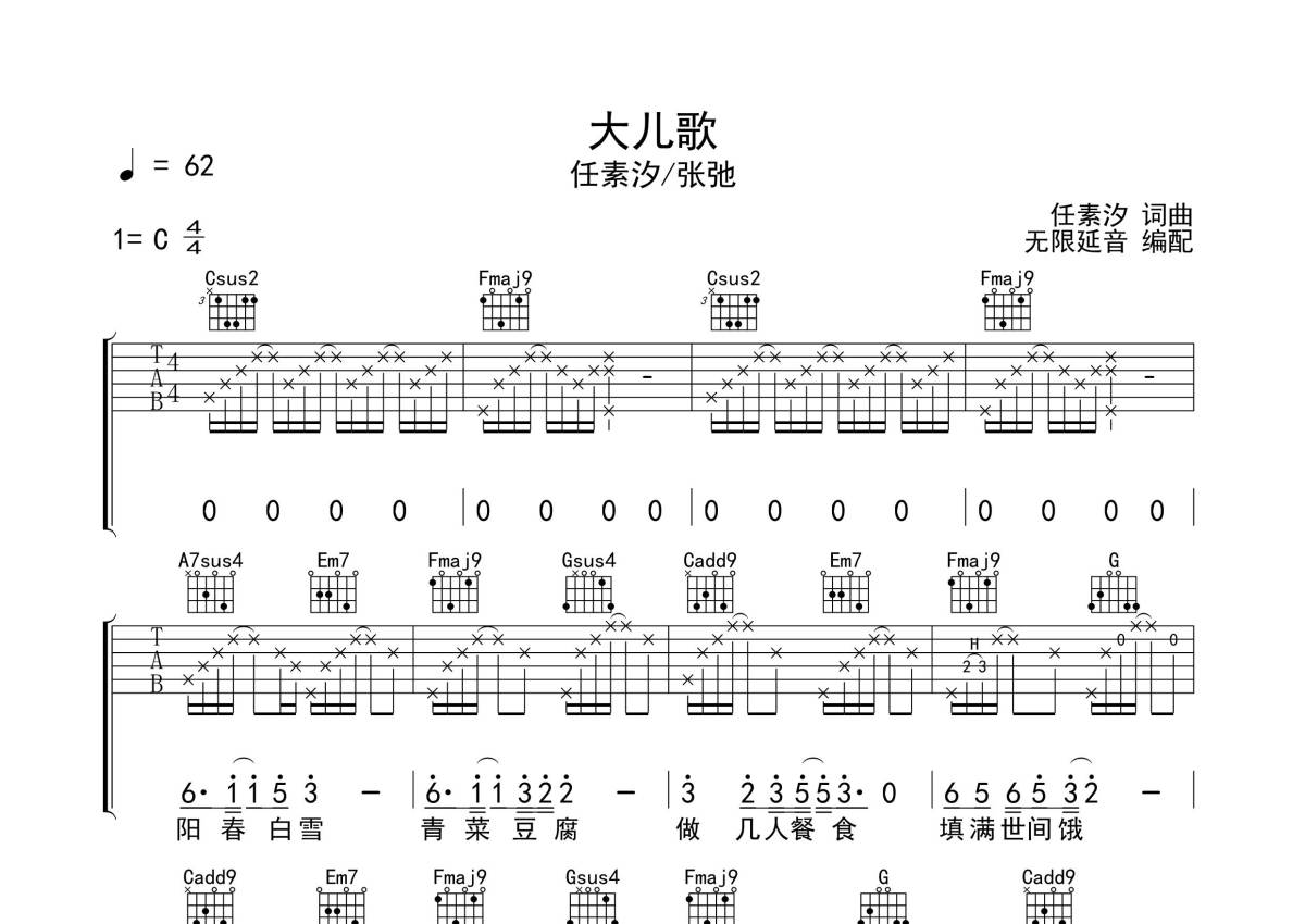 曲谱介绍: 任素汐《大儿歌》吉他弹唱谱,采用C调指法编配,无限延音编配出品,共有2张高清图谱,免翻页排版设计。