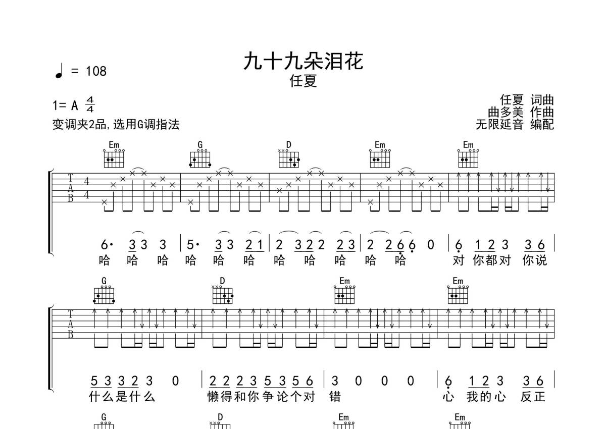 曲谱介绍: 任夏《九十九朵泪花》吉他弹唱谱,采用G调指法编配,无限延音编配出品,共有2张高清图谱,免翻页排版设计。