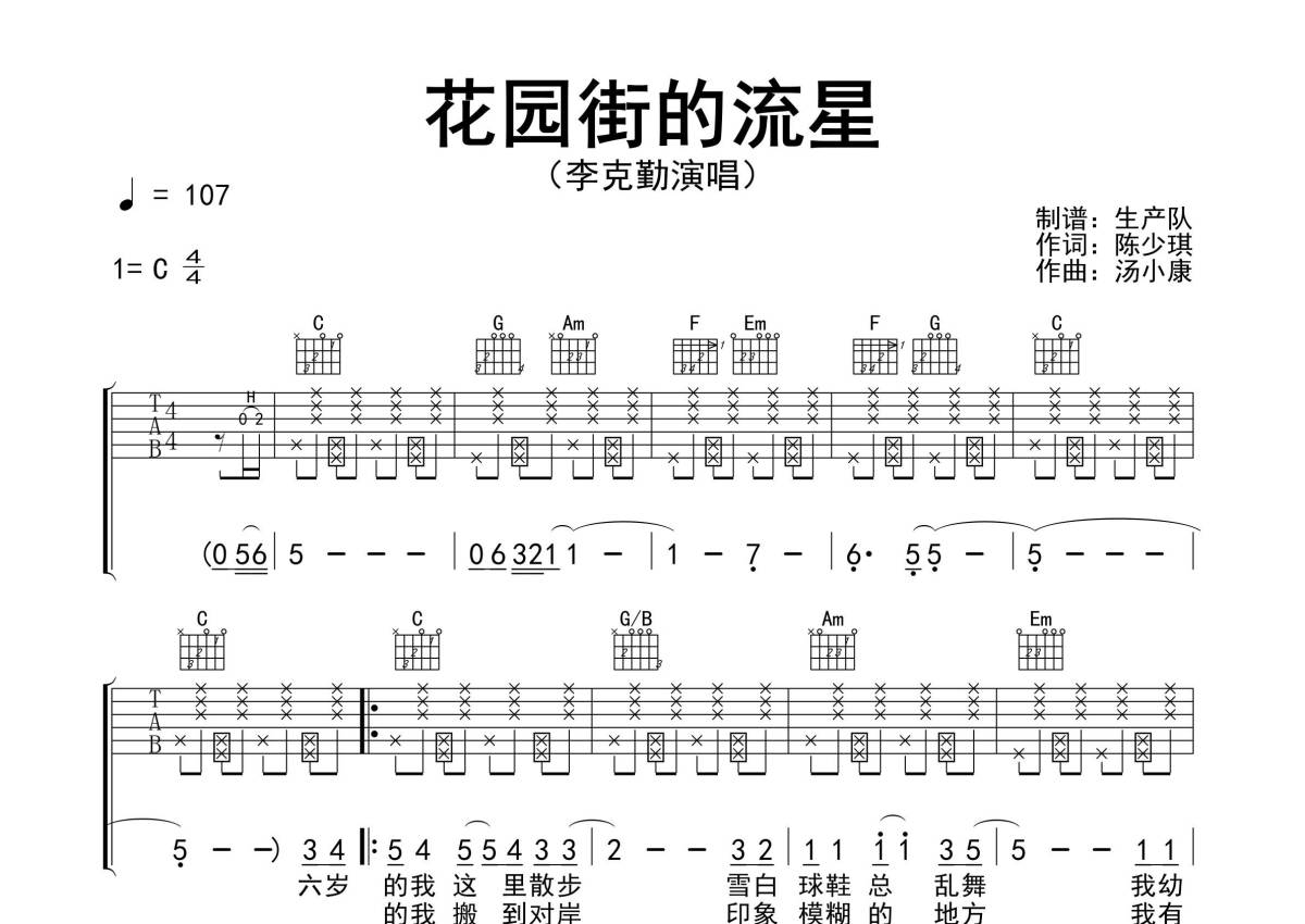 曲谱介绍: 李克勤《花园街的流星》吉他弹唱谱,采用C调指法编配精编完美版,生产队编配出品,共有3张高清图谱。