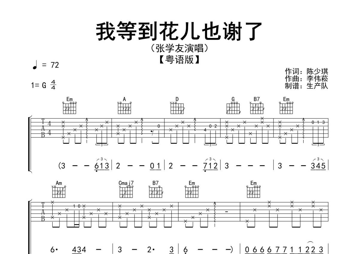 曲谱介绍: 张学友《我等到花儿也谢了》吉他弹唱谱,采用G调指法编配精编完美版,生产队编配出品,共有3张高清图谱。