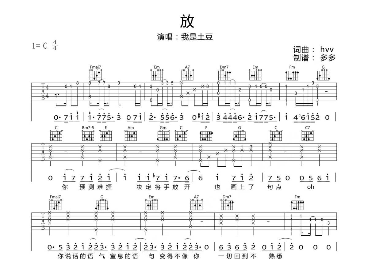 • 放吉他谱 - 我是土豆 - C调吉他弹唱谱第1张