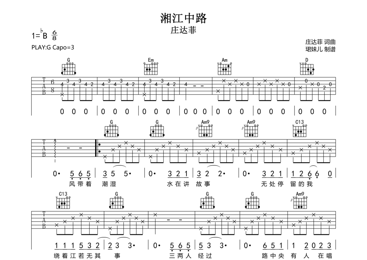 • 湘江中路吉他谱 - 庄达菲 - G调吉他弹唱谱第1张