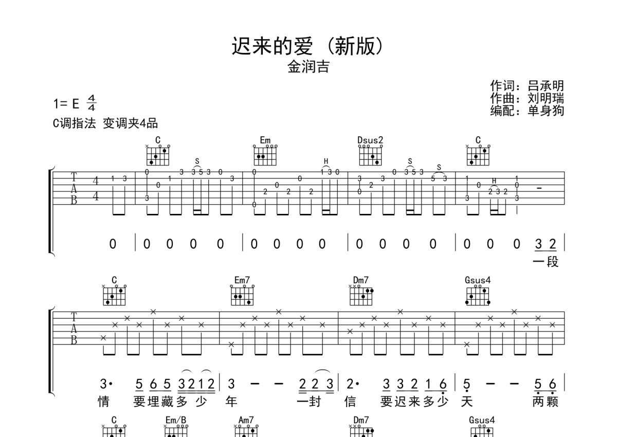 曲谱介绍: 金润吉《迟来的爱》吉他弹唱谱,采用C调指法编配新版,单身狗编配出品,共有2张高清图谱,免翻页排版设计。
