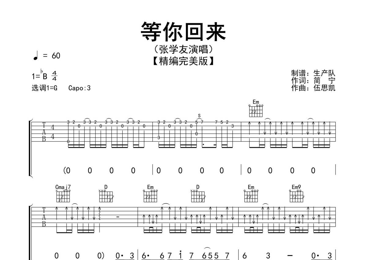 曲谱介绍: 张学友《等你回来》吉他弹唱谱,采用G调指法编配精编完美版,生产队编配出品,共有3张高清图谱。