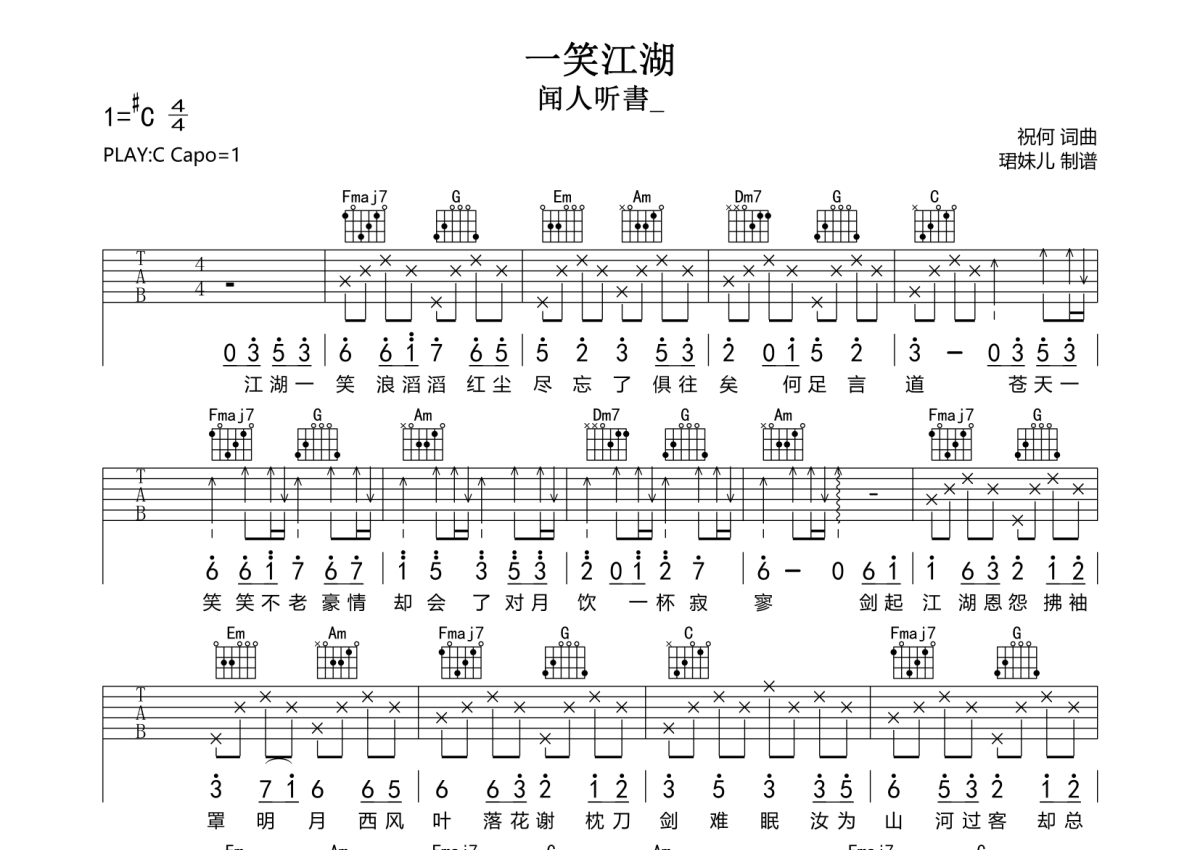 • 一笑江湖吉他谱 - 闻人听書 - C调吉他弹唱谱第1张