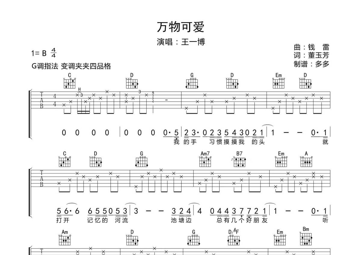 • 万物可爱吉他谱 - 王一博 - G调吉他弹唱谱第1张