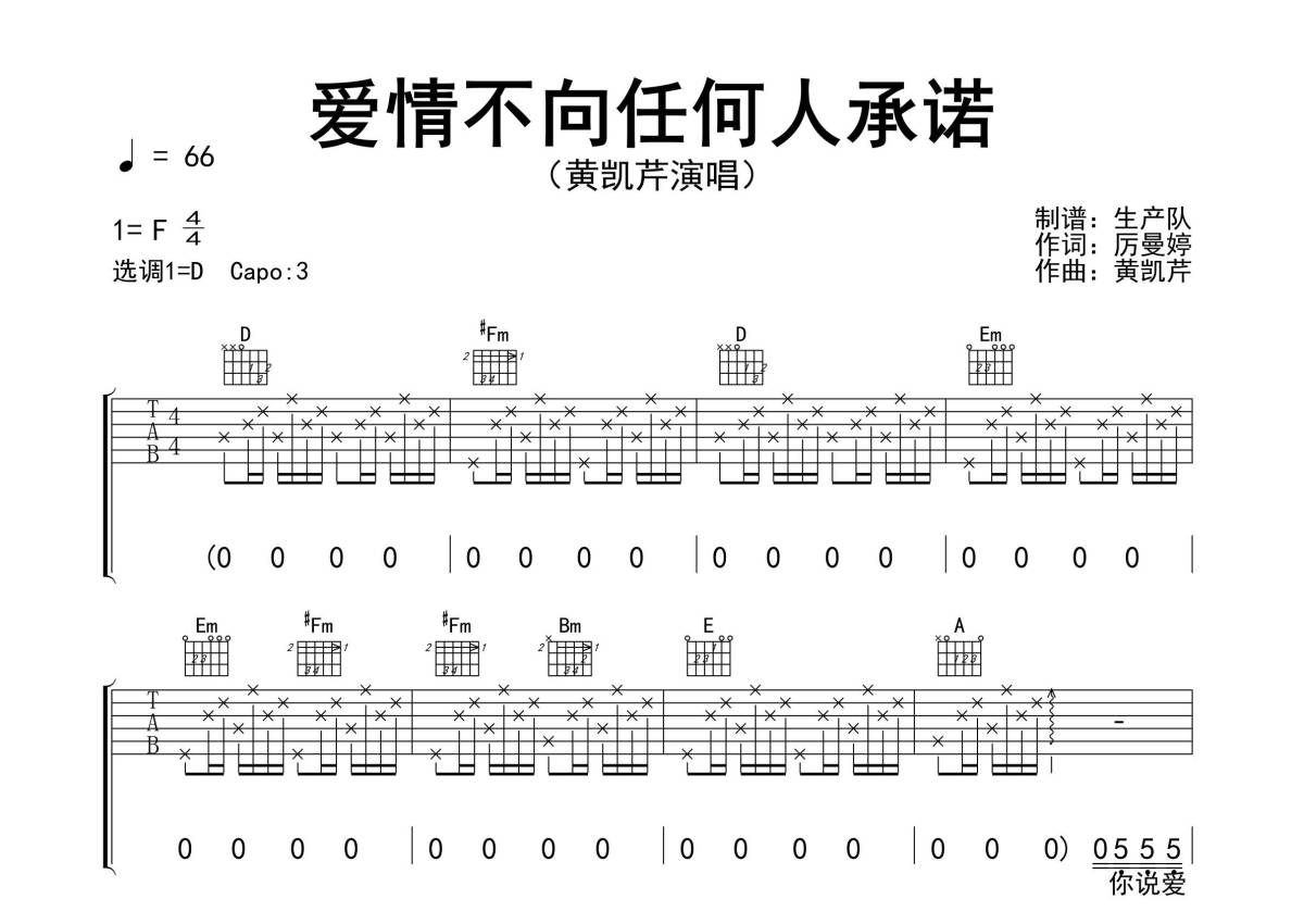 曲谱介绍: 黄凯芹《爱情不向任何人承诺》吉他弹唱谱,采用D调指法编配精编民谣版,生产队编配出品,共有3张高清图谱。