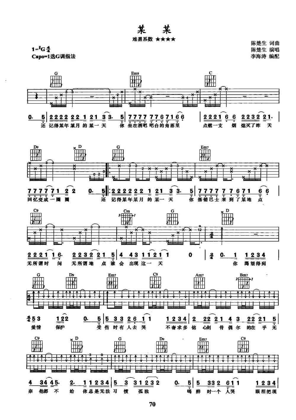 曲谱介绍: 陈楚生演唱的一首歌曲,4/4拍的节奏,这首歌曲的原调为降A调,这里曲谱采用了G调指法进行编配,演唱时夹变调夹1品可回到原调,也可根据个人实际嗓音情况选择。曲谱由琴谱网更新上传,来源于@李海涛编配出品。这首歌是陈楚生写给失意人的歌,它乍听太“博爱”,“博爱”到让每一个听歌的人都能将自己的名字代入到“某某”中,在舒扬的旋律中享受被慰藉。