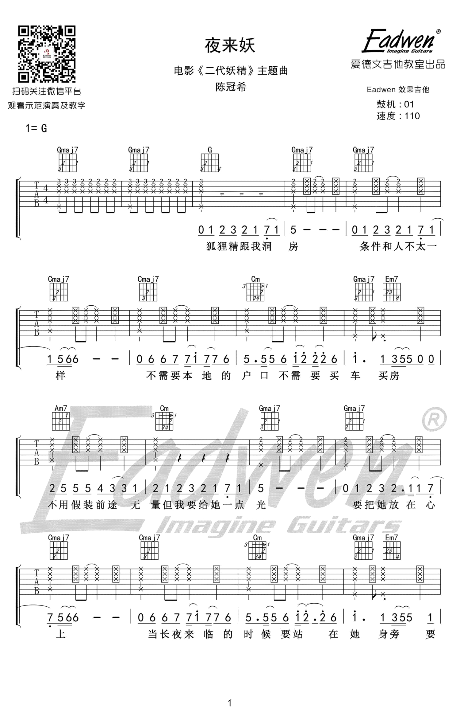 夜来妖吉他谱 - 陈冠希 - G调吉他弹唱谱