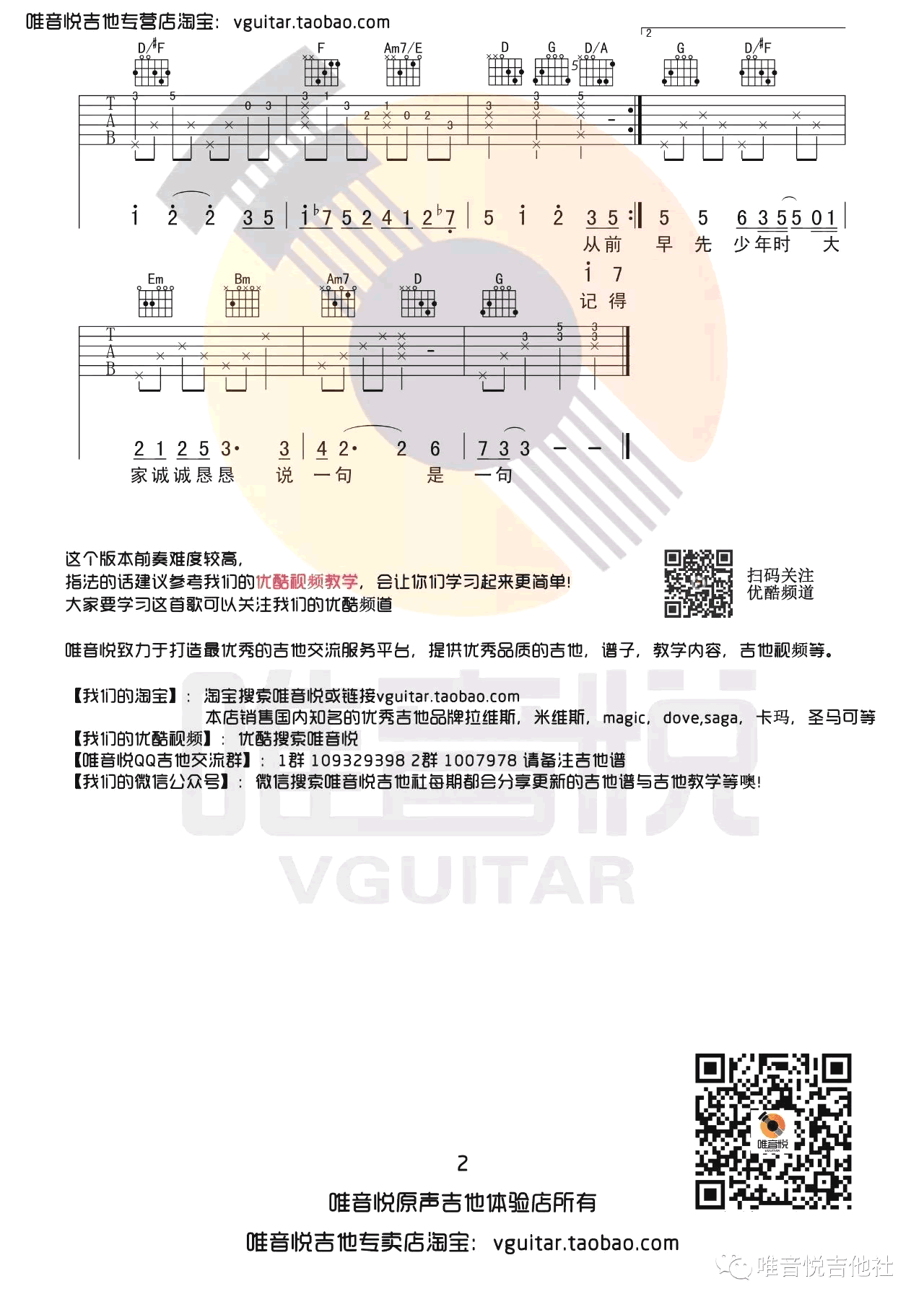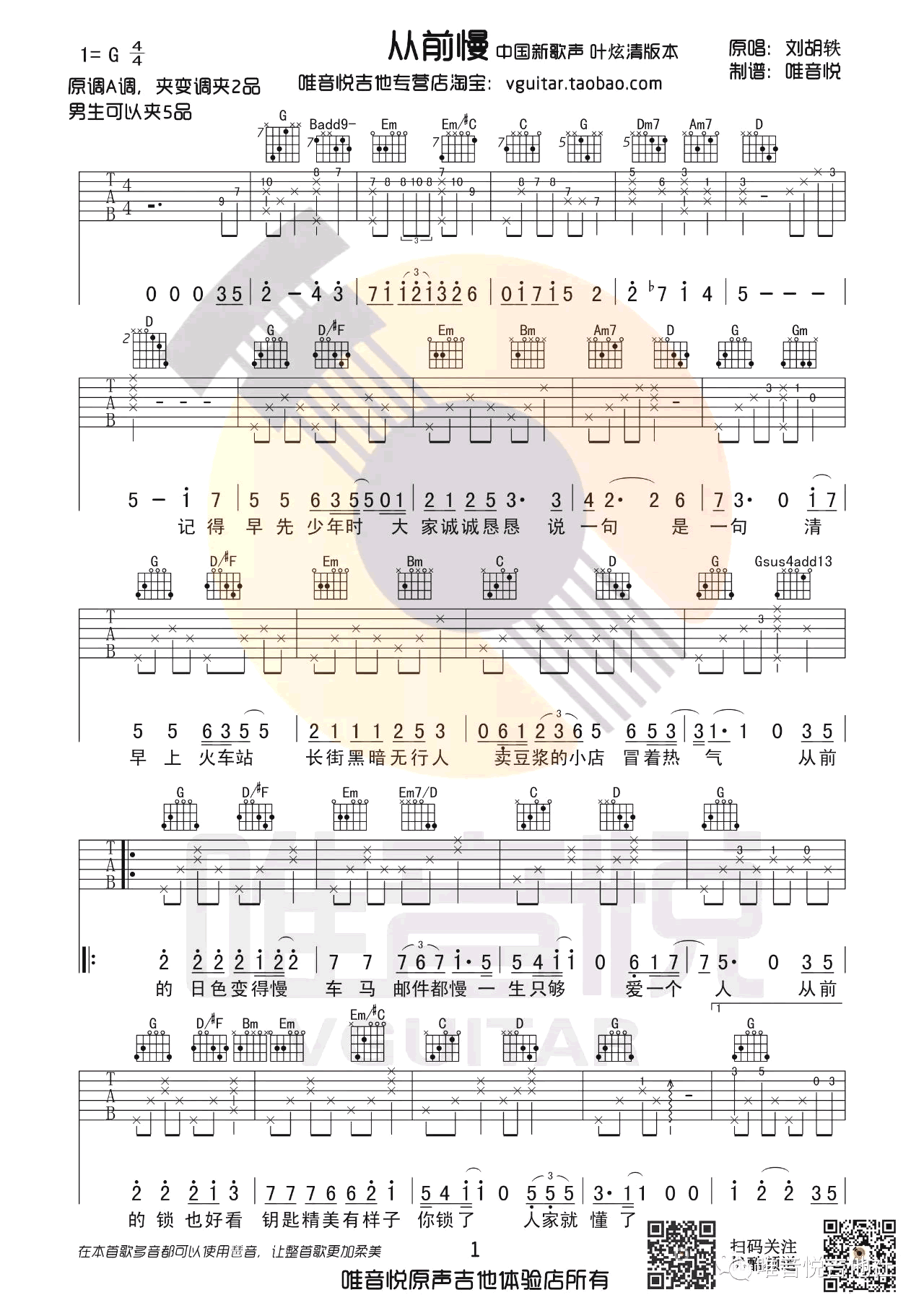 曲谱介绍: 叶炫清在《中国新歌声》节目翻唱演绎的一首民谣歌曲,从前慢吉他谱,原调A,选用G调和弦指法,女生变调夹夹第二品,男生建议夹五品,两张图片六线谱。《从前慢》吉他弹唱演示示范,同学们参照视频练习。沉静而质朴的歌声充满画面感,在当今忙碌浮躁的现代生活节奏中,一下子就触动人的内心,开始审视自己的脚步。