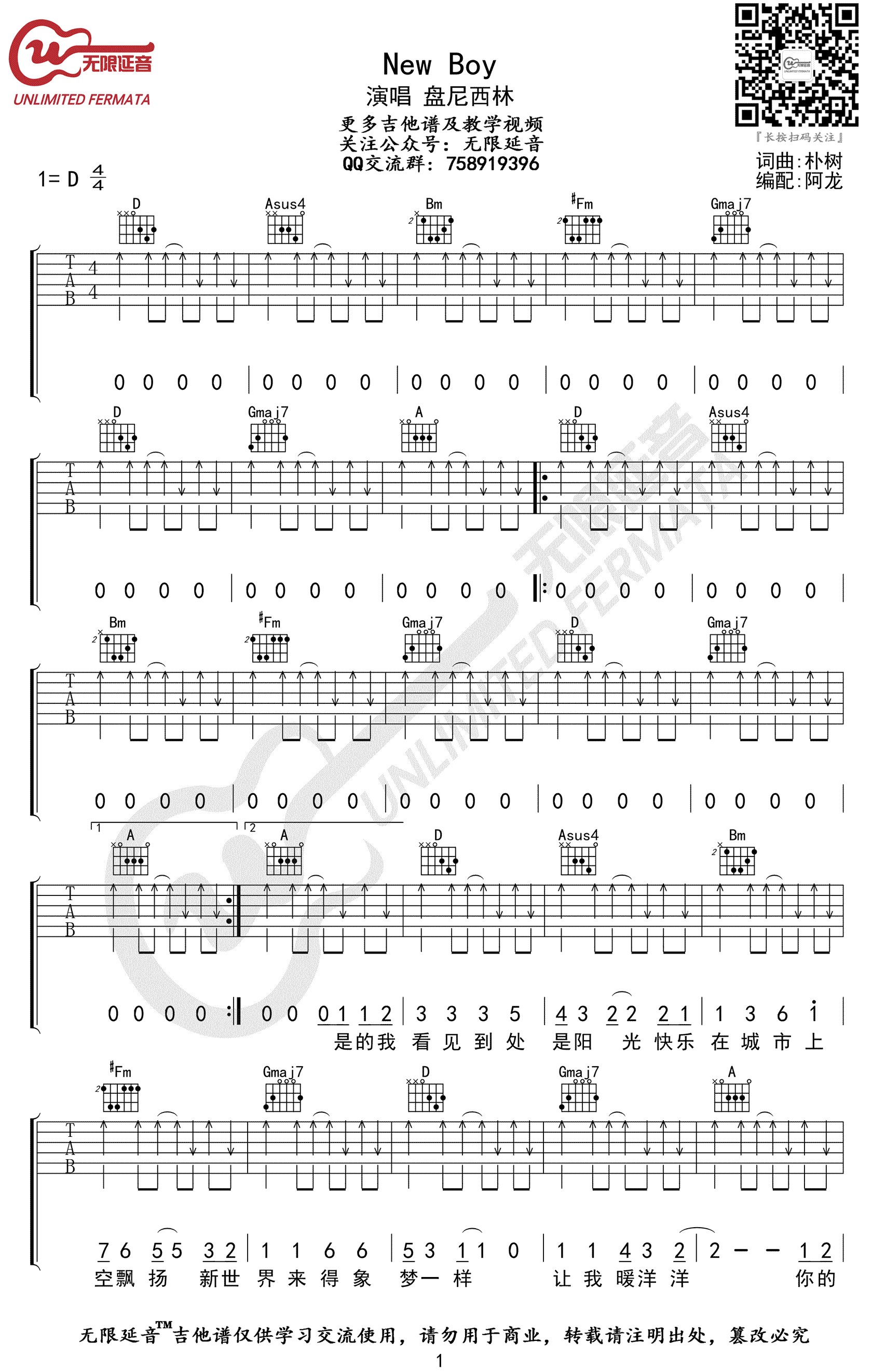 New Boy吉他谱 - New - D调吉他弹唱谱