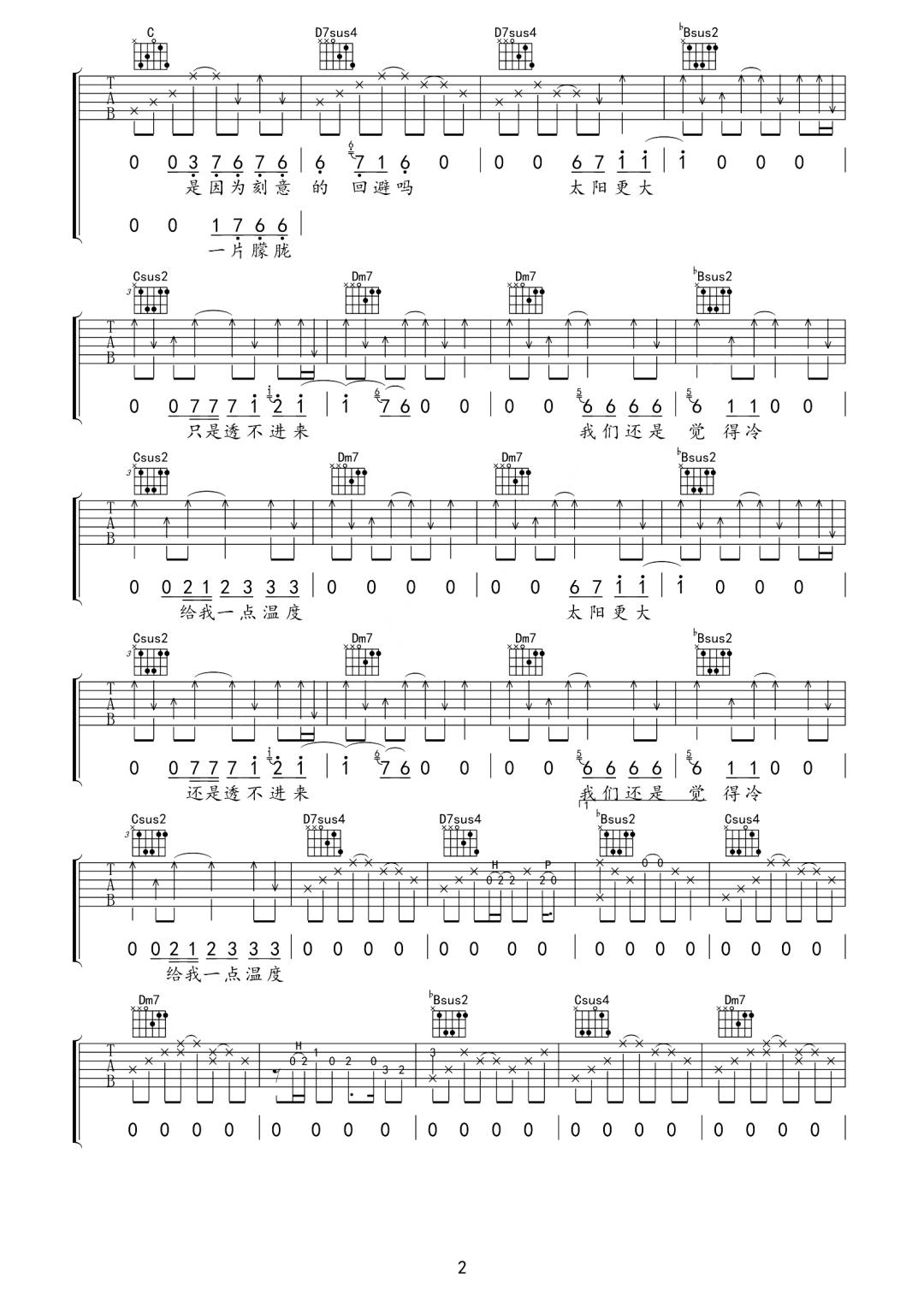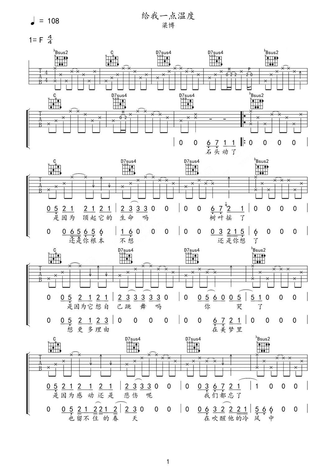 曲谱介绍: 梁博演唱的一首歌曲,4/4拍的节奏,这首歌曲的原调为F调,这里曲谱采用了F调指法进行编配,演唱时可不夹变调夹,曲谱由琴谱网更新上传,曲谱来源于网络转载,编配制谱者暂不详。这还搜歌歌词依然带着梁博有些“明知故问”的反问语气,简单有力的去触碰人们的内心。就如歌中所唱,“太阳更大,还是透不进来,我们还是觉得冷,给我一点温度”。
