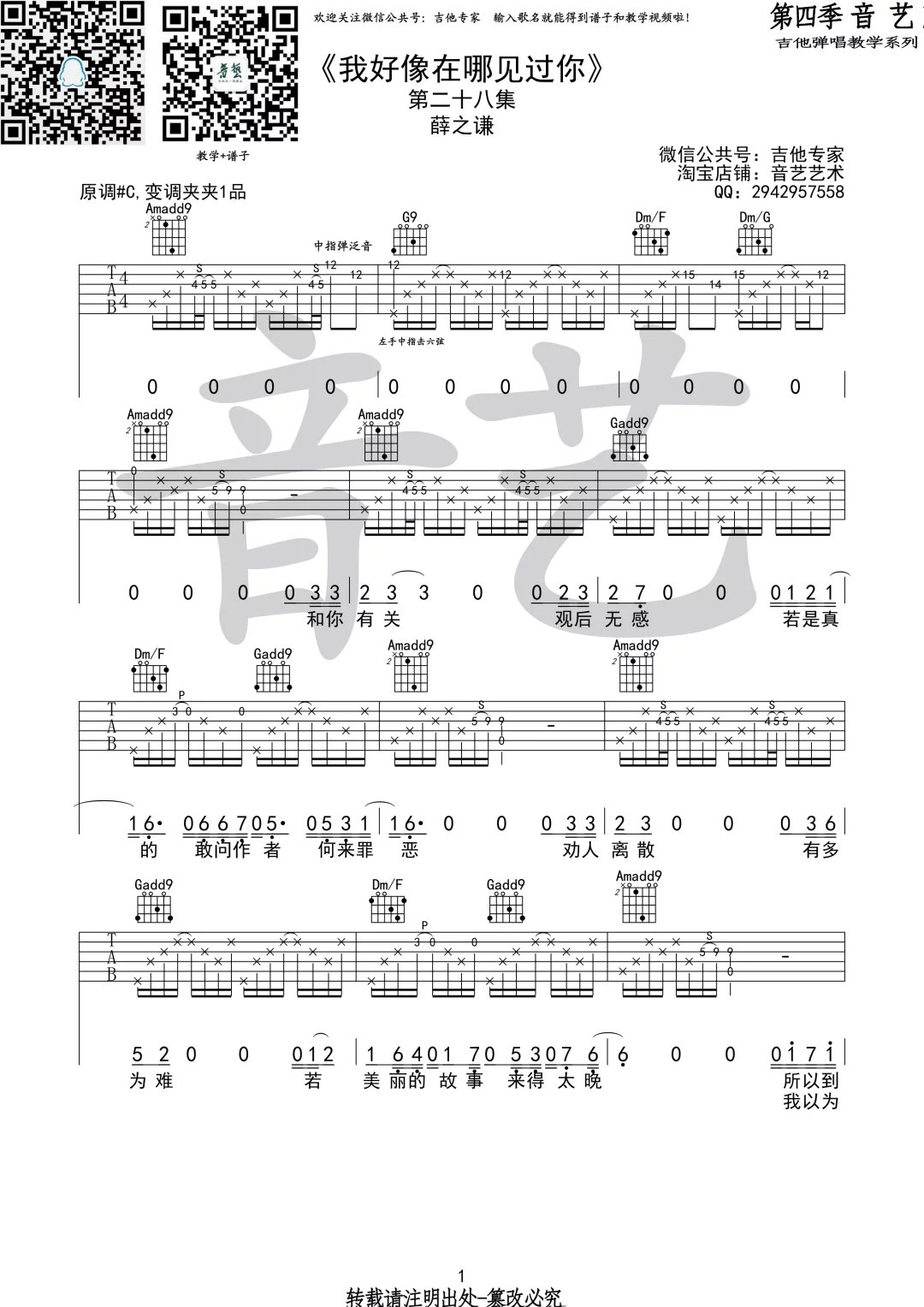 曲谱介绍: 我好像在哪见过你吉他谱,C调指法版吉他弹唱谱,来自吉他专家编配,原调#C调,变调夹夹第一品为原调。歌曲的前奏编配的有些难度,非常还原原曲的钢琴伴奏听感,副歌部分的过渡也很有味道,大家可以好好体会下。 薛之谦《我好像在哪见过你》,平静的旋律下却是暗潮汹涌,蕴藏着情感的漩涡。“我听不见你的声音,怕脱口而出是你姓名。”一段尘封的爱情故事,在薛之谦深情的演唱中慢慢解开。