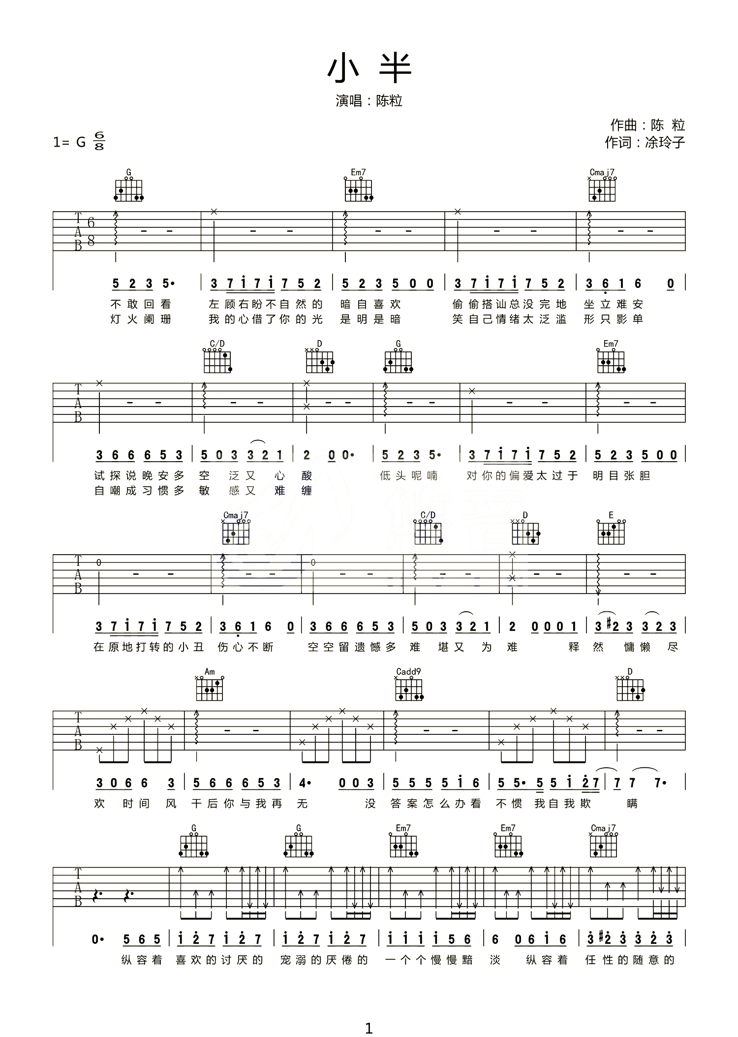 小半吉他谱 - 陈粒 - G调吉他弹唱谱 - 原版