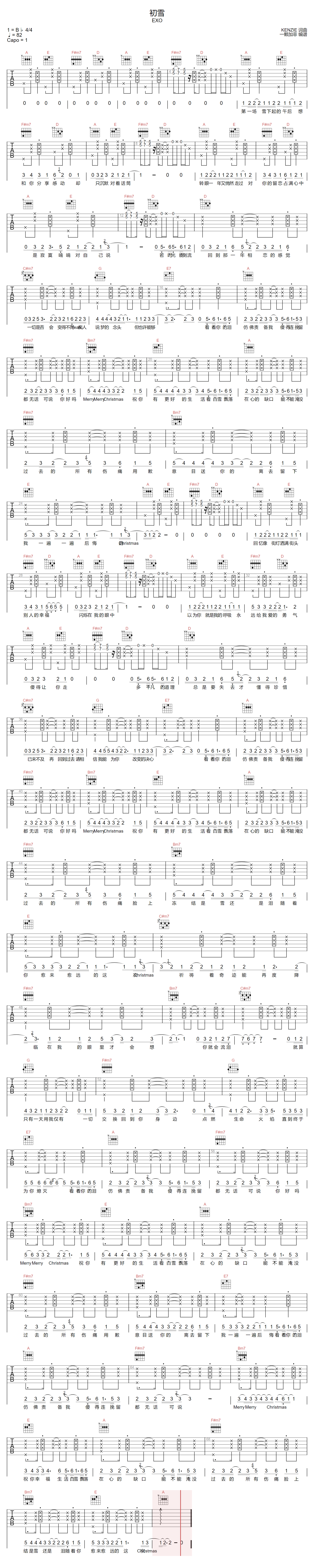 初雪吉他谱 - EXO - A调吉他弹唱谱 - 原版