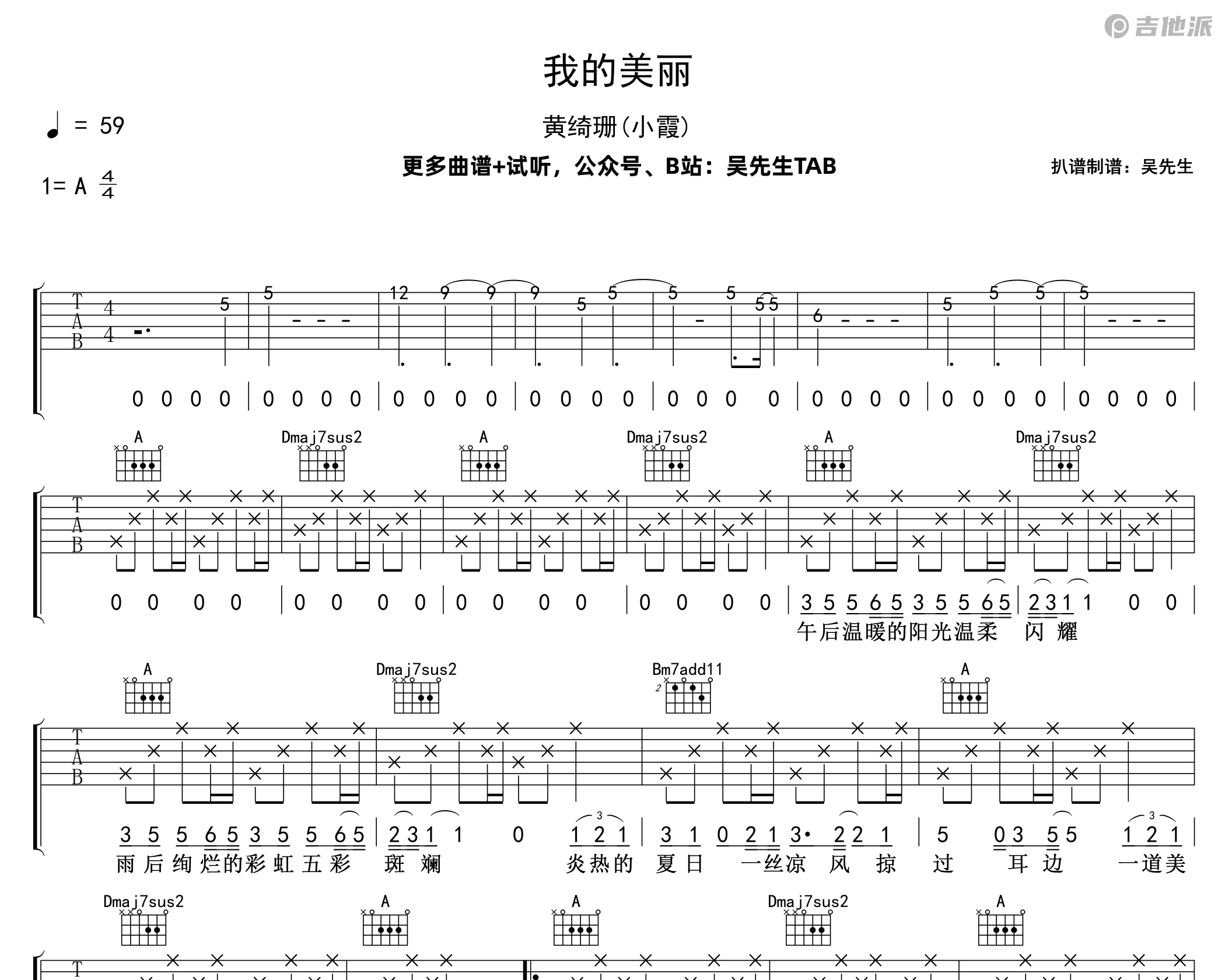 曲谱介绍: 我的美丽吉他弹唱谱,A调原版吉他弹唱谱,来自吴先生编配伴奏谱,琴友们也可以根据自己嗓音条件选择变调夹,演奏速度大概59拍每分钟,附演示音频试听。 黄绮珊《我的美丽》,欣赏一切不同的独特的事物,也学会接受包容自己的不完美,并在不完美中追求完美,便是成就“我的美丽”。