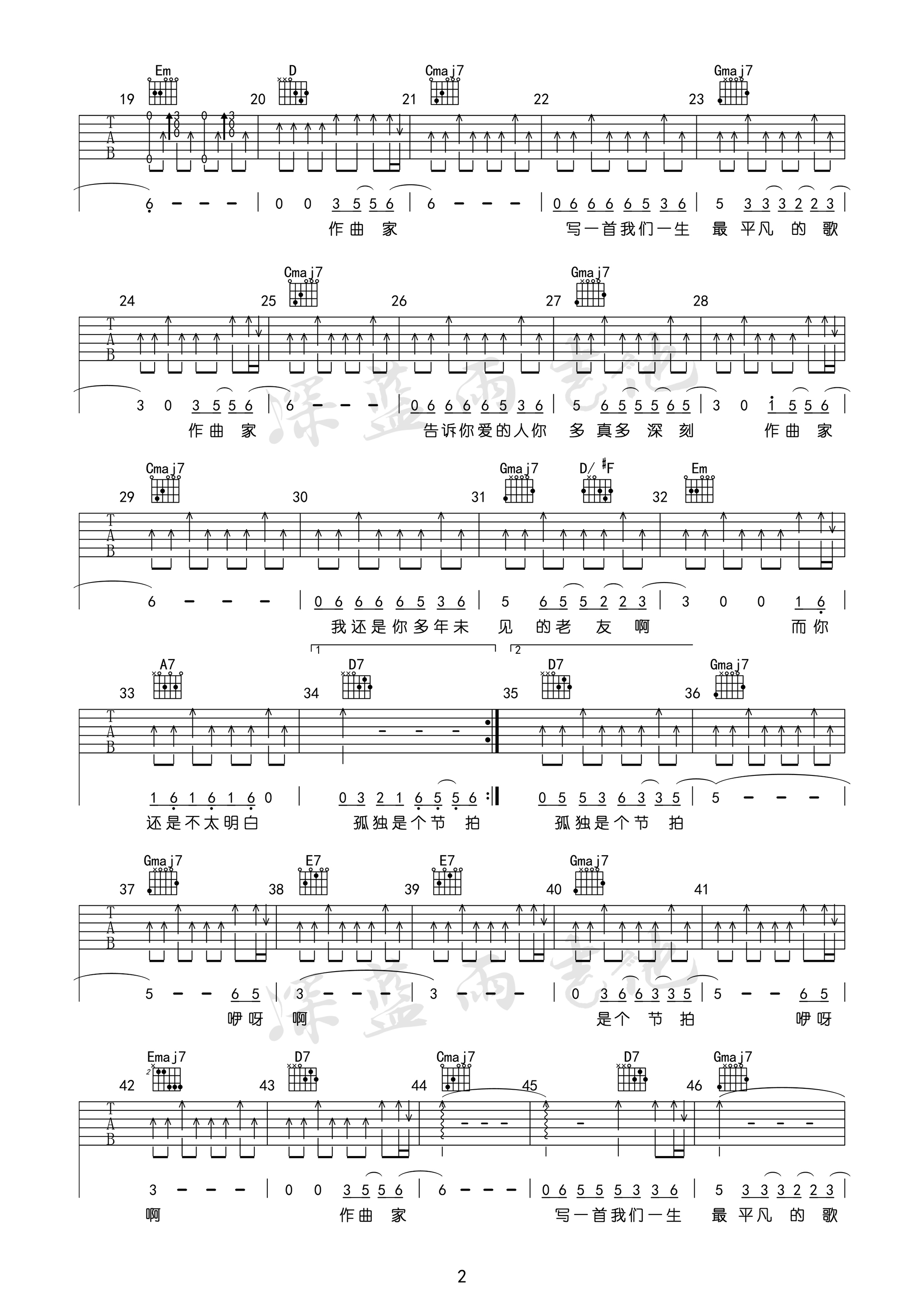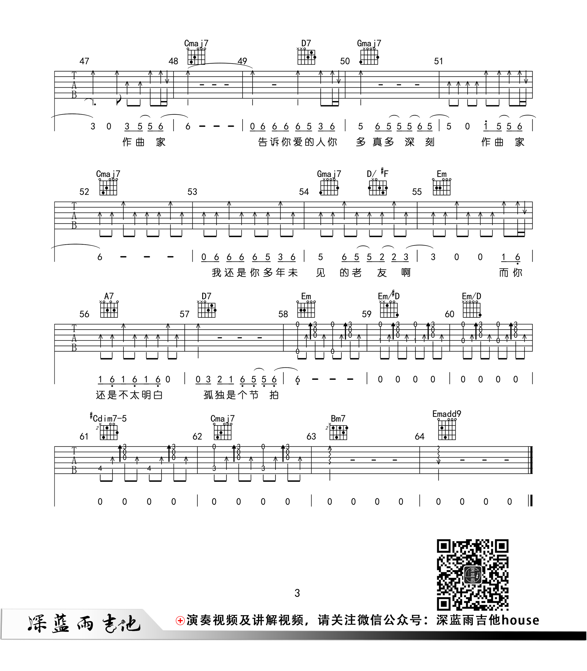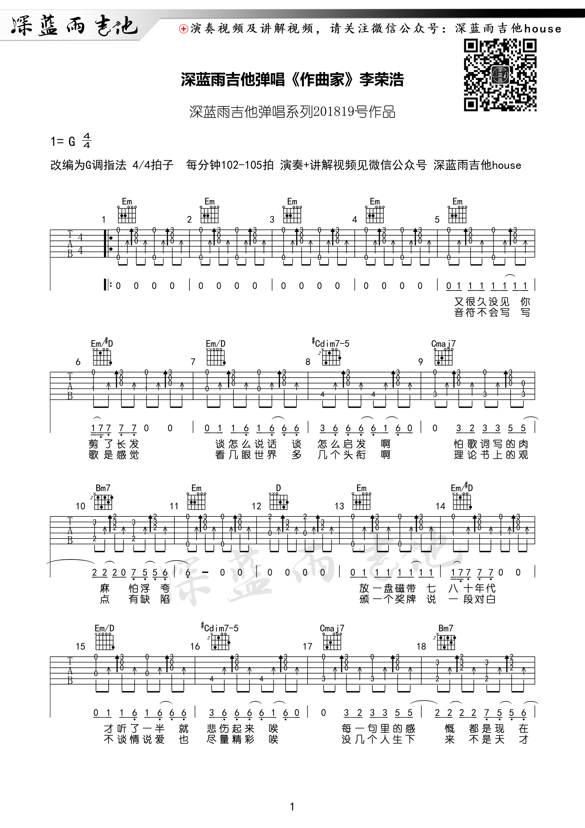 曲谱介绍: 作曲家吉他谱,G调编配版吉他弹唱谱,来自深蓝雨老师编配版吉他伴奏谱,附教学讲解视频。这首歌的演奏大家应注意扫弦的节奏感,尤其是低音弦和高音弦的不同层次,副歌部分有明显的低音下行,大家可以感受下这种感觉。  吉他弹唱演示及视频教学  《作曲家》吉他弹唱教学视频