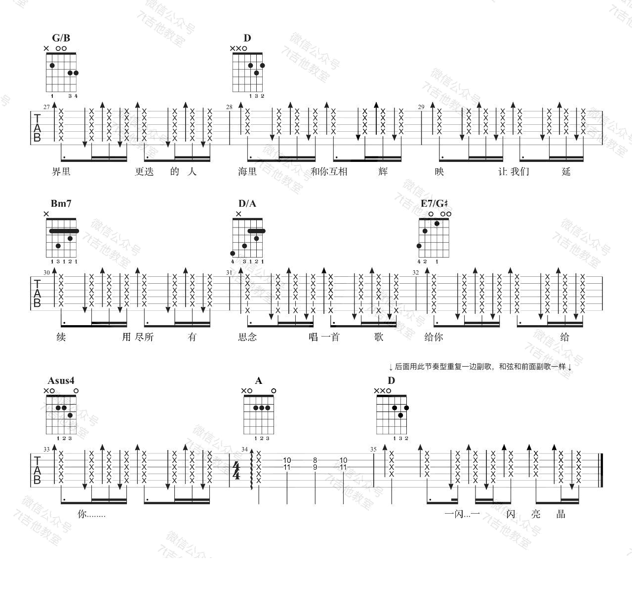 曲谱介绍: 孙燕姿演唱的一首歌曲,4/4拍的节奏,这首歌曲的原调为C调,这里曲谱采用了D调指法进行编配,演唱时降全音调弦可回到原调,也可根据个人实际嗓音情况选择不降音或夹几品。曲谱由琴谱网更新上传,来源于@7T吉他教室编配出品。这首歌是乐坛上少有的花了快半年的时间创造的歌曲,这也证明了孙燕姿的认真与对音乐作品的苛刻。
