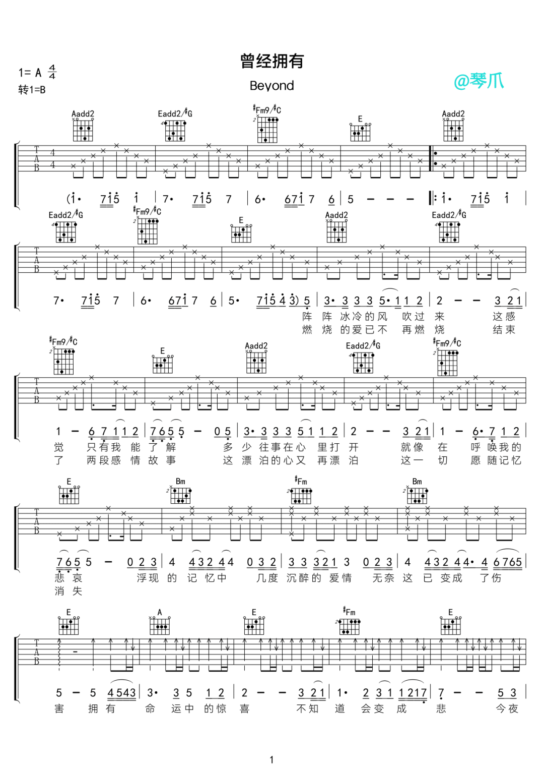 曾经拥有吉他谱 - Beyond - A调吉他弹唱谱 - 原版