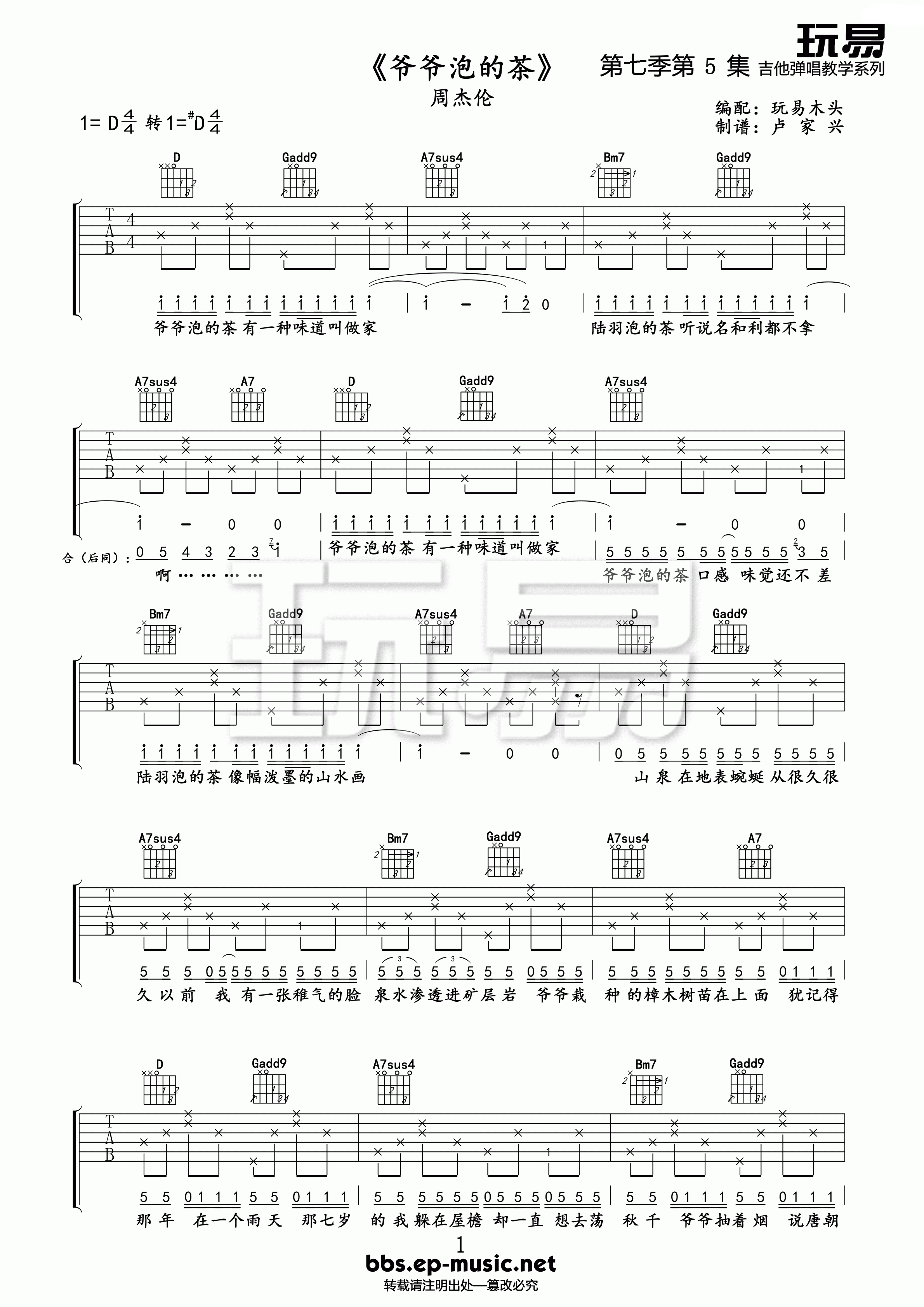 爷爷泡的茶吉他谱 - 周杰伦 - D调吉他弹唱谱 - 原版