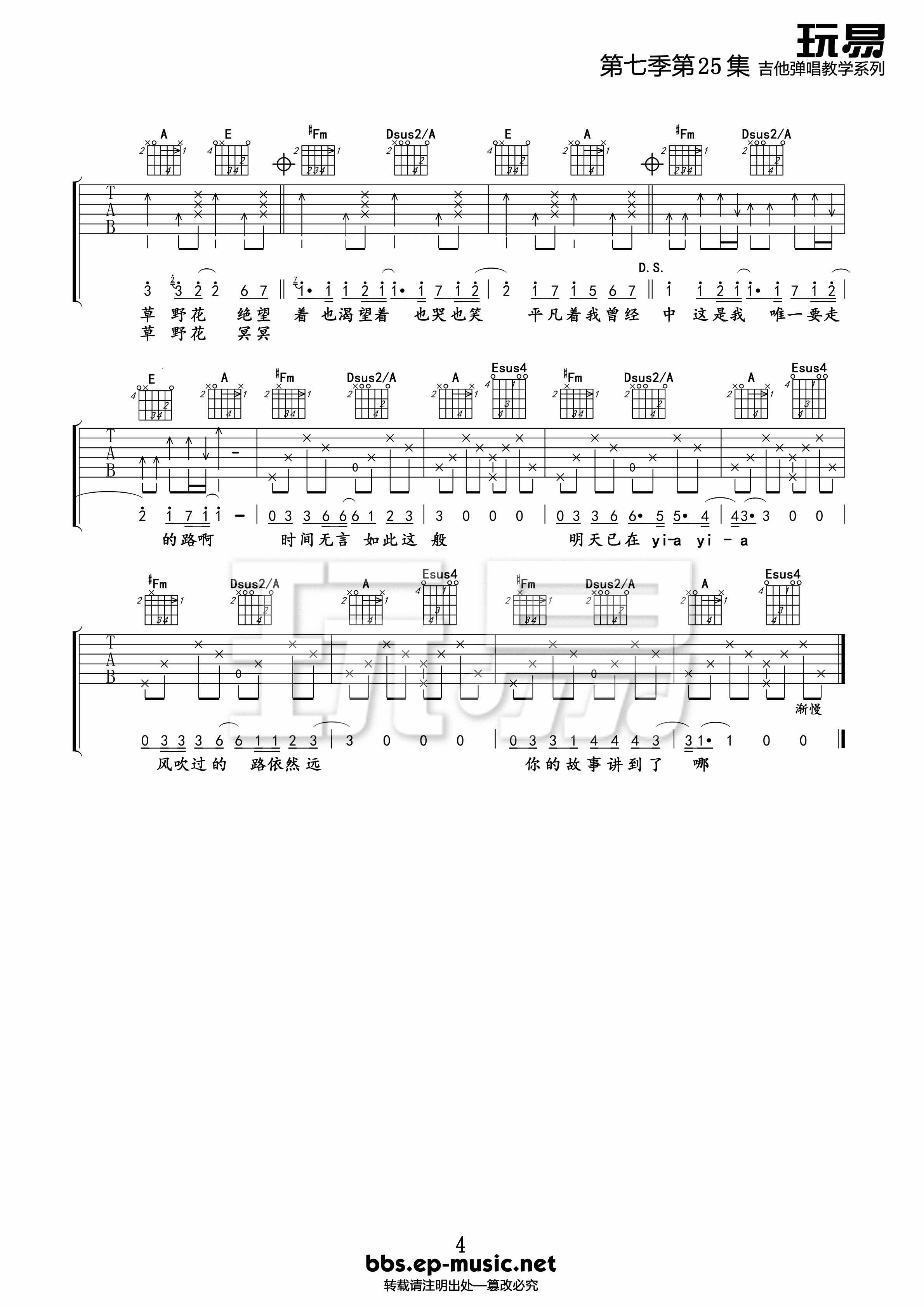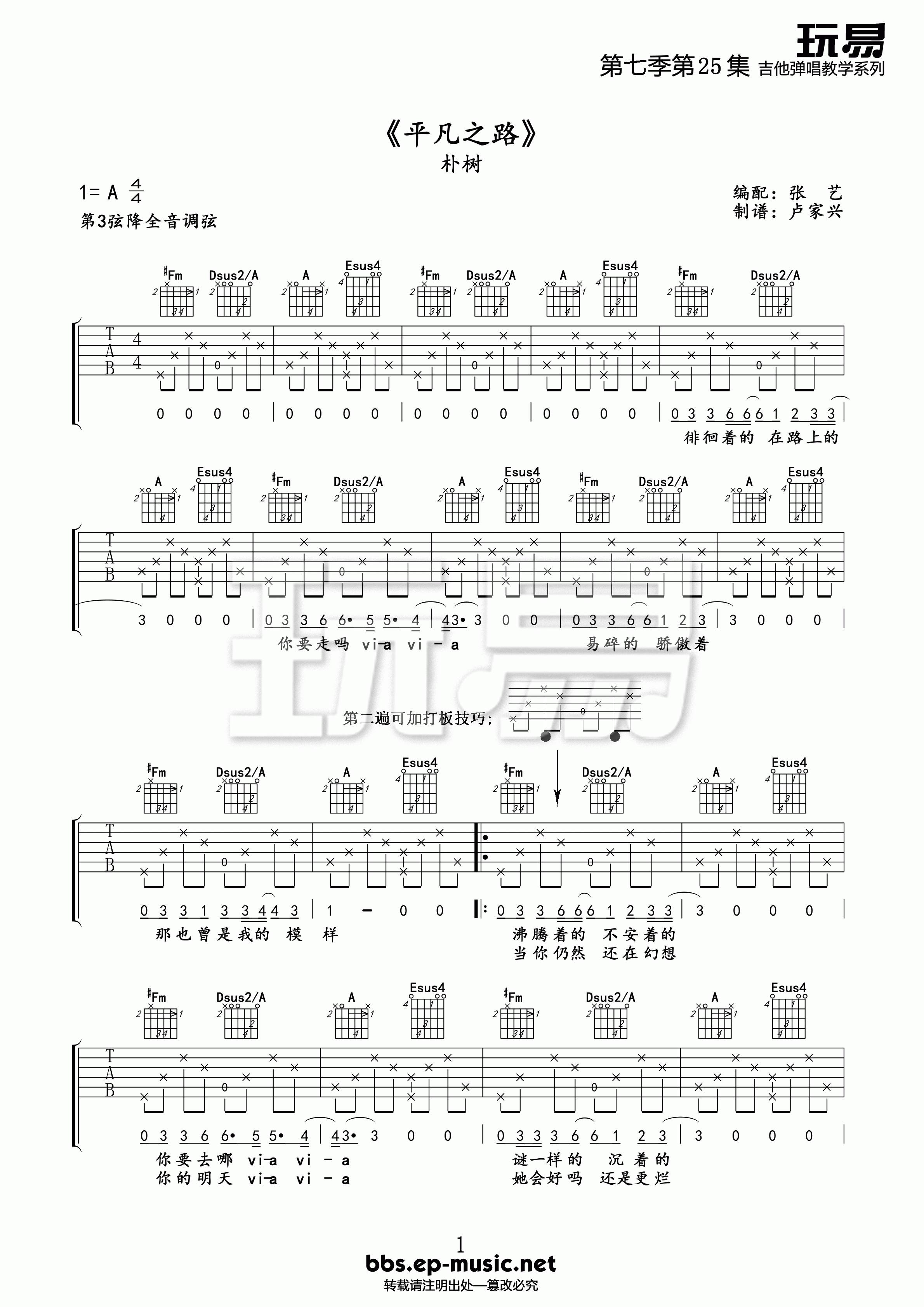 曲谱介绍: 平凡之路吉他谱,来自玩易卢老师编配吉他弹唱谱,A调指法版,高清四张图谱。这首歌作为吉他神曲,站内已经整理了很多版本的曲谱,一般都是G调指法,本文版本为A调版,大家可以尝试下。 ,整篇的分解和弦很典型的6415和声走向,A调和弦难度较大,有大量的封闭和弦,可以用作开指练习。在第二遍演奏时,第二拍和第四拍可以加入打板的技巧,副歌部分用扫弦增加层次感,整体难度较大,适合琴友进阶练习。 简单版吉他谱:平凡之路吉他谱 G调带间奏版弹唱吉他谱 完整版吉他谱。