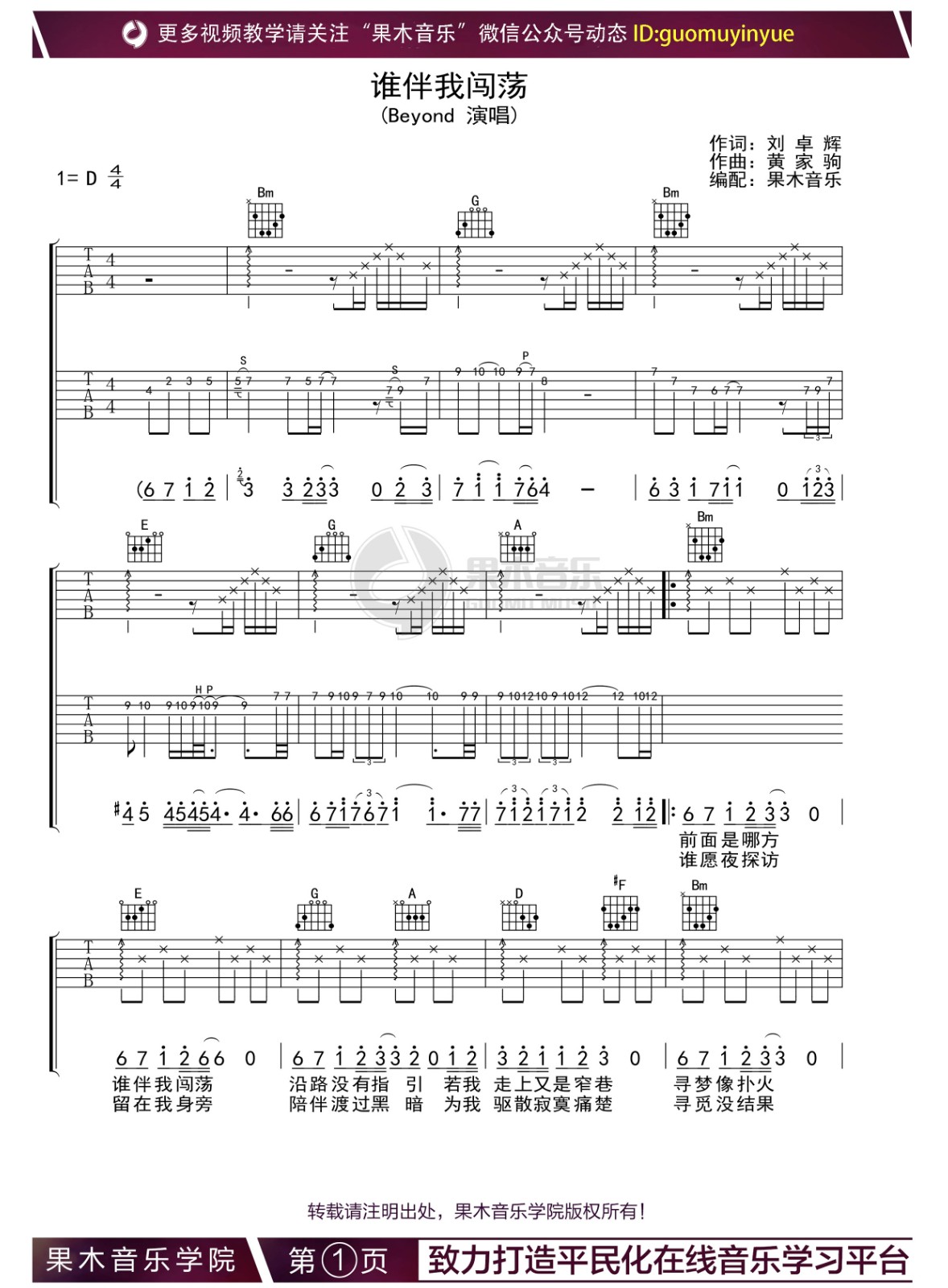 曲谱介绍: 谁伴我闯荡吉他谱,D调版吉他弹唱谱,来自果木音乐编配,双吉他伴奏版。一把吉他演奏可以只弹伴奏部分,副歌扫弦部分的和弦有点难度,使用的封闭和弦较多。 Beyond《谁伴我闯荡》,悲愤但不颓丧的旋律有着神奇的力量,它能使人忘却烦恼,开阔胸襟;它能使人奋发向上,充满斗志。歌里那种对未来感到迷惘和对现实理想的不满,曲调虽然悲凉,但在不如意时,仍不忘对自己鼓励。