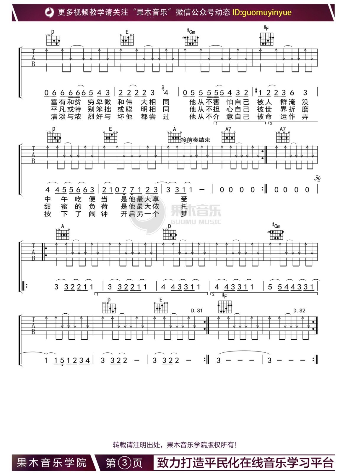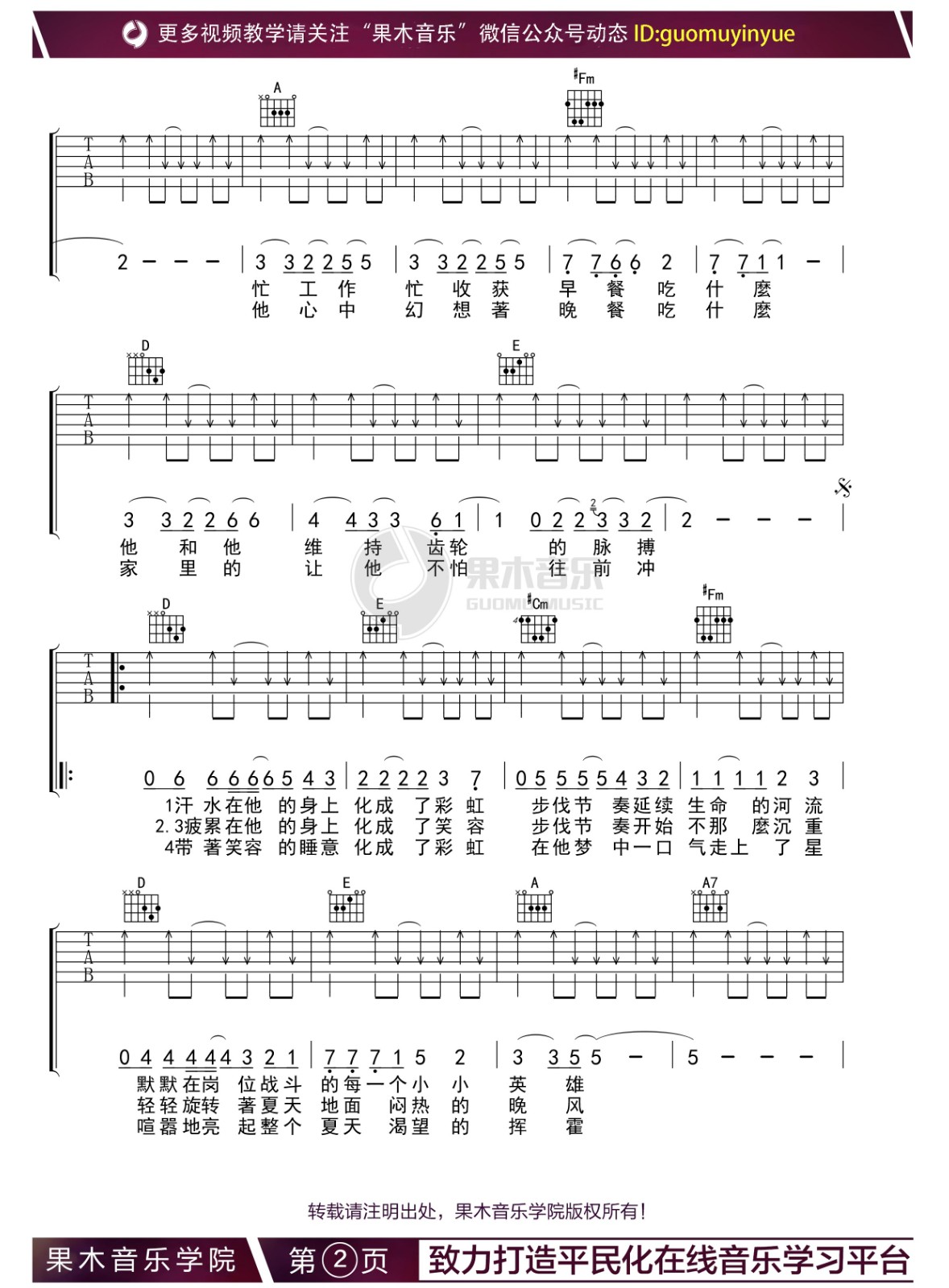 曲谱介绍: 他夏了夏天吉他谱,A调指法版吉他六线谱,来自果木老师编配制谱。这首歌的右手伴奏型非常简单,基本毫无难度。大家的练习重点可以放在左手和弦的准确把握上。 他夏了夏天,汗水化成了彩虹,苏打绿《他夏了夏天》,一首平凡人的励志之歌。轻快的节奏,细腻的歌词,这首歌里我们仿佛听到了自己,那是属于平凡的人的温热与曲折。 他夏了夏天吉他伴奏谱,共三张谱例: