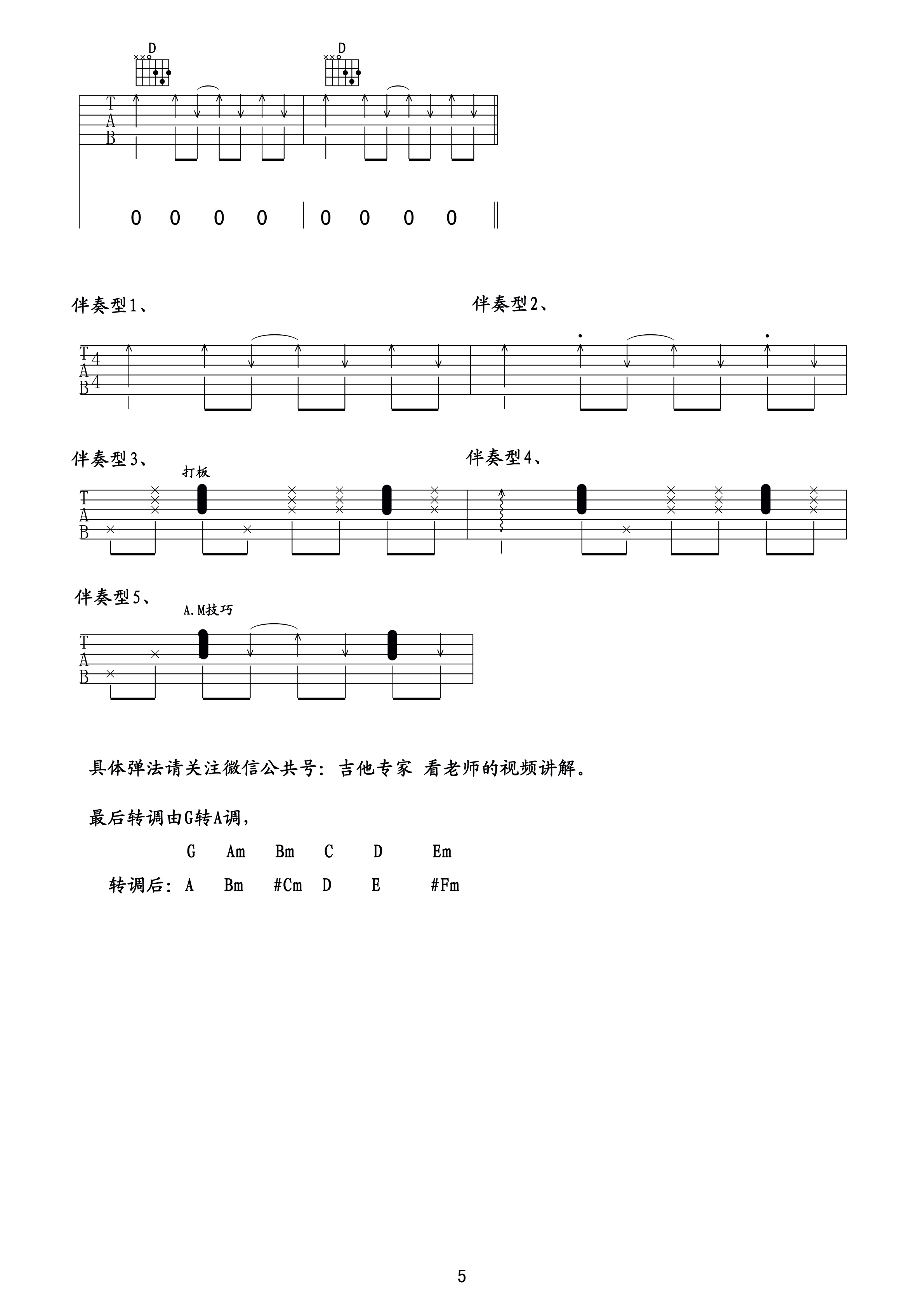 曲谱介绍: 不说再见吉他谱,G调转A调版吉他弹唱谱,来自吉他专家编弹唱谱。这里用的节奏型都是非常基础的扫弦节奏型,在第五张谱例有一些替代的节奏参考,大家可以用切音或打板的律动来弹唱,效果更好。  吉他弹唱演示及视频教学  《不说再见》吉他弹唱教学视频 不说再见吉他弹唱六线谱,共五张谱例:
