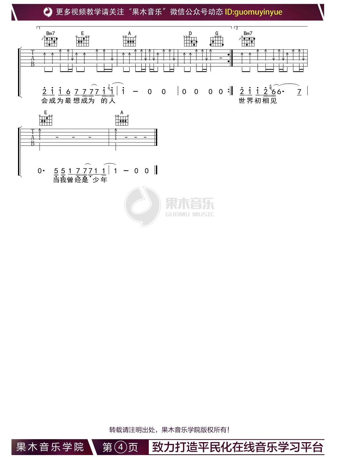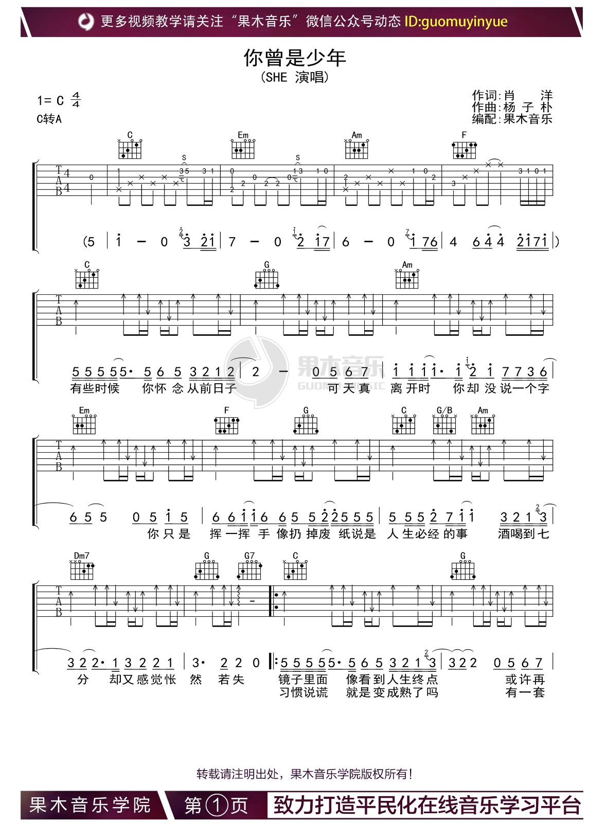 曲谱介绍: 你曾是少年吉他谱,C调版吉他弹唱谱,副歌部分转A调,来自果木浪子编配制谱。这首歌的编配基本都是采用扫弦的伴奏形式来完成的,前奏部分有一段小旋律。 S.H.E《你曾是少年》,在这个越来越忙碌的时代,希望我们能永远记住初心,记得我们在人生旅途刚出发的样子,也希望大家能在这首歌里感受到历历在目的青春岁月! 你曾是少年弹唱伴奏谱,共四张谱例: