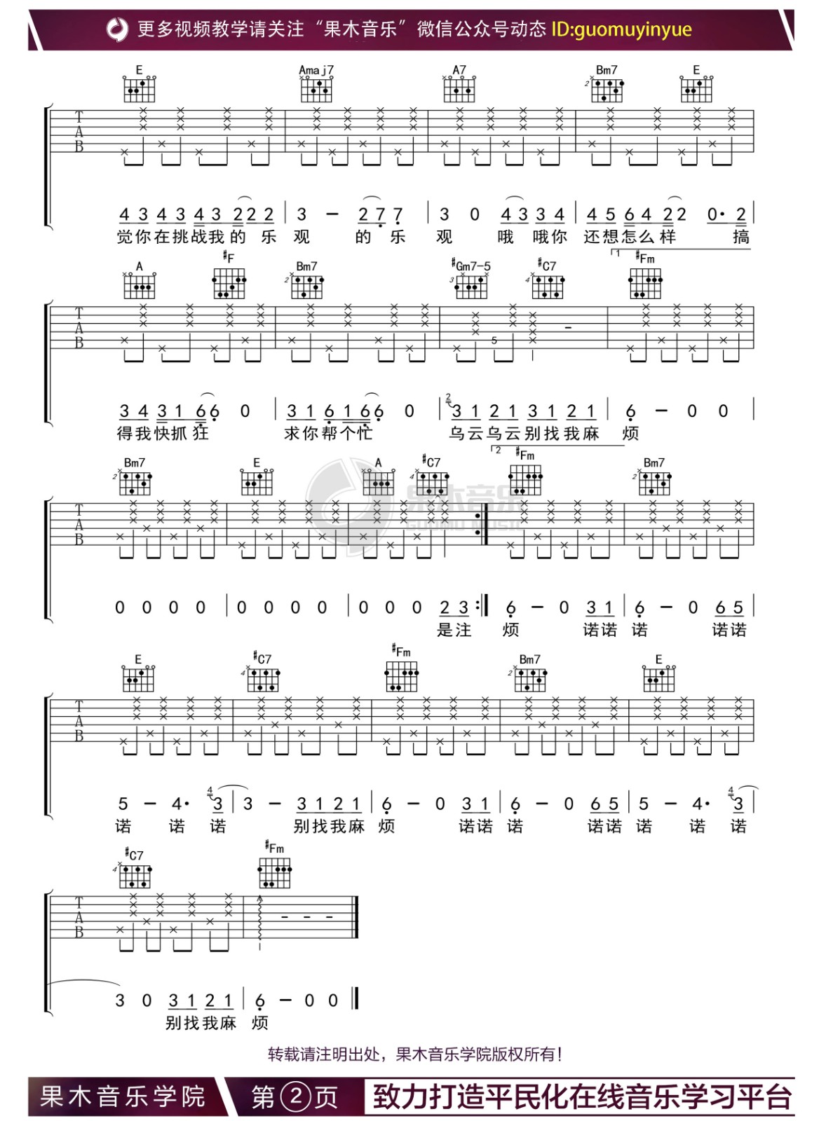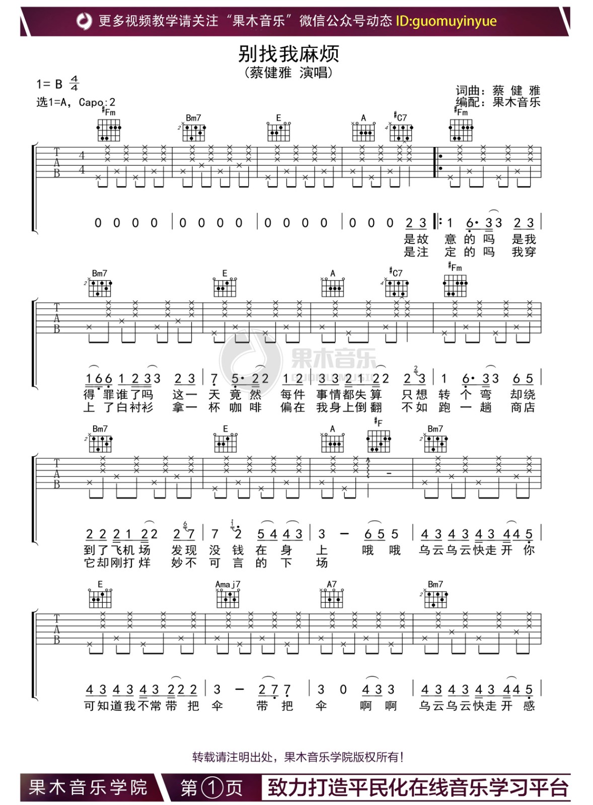曲谱介绍: 别找我麻烦吉他谱,A调和弦指法编配版吉他弹唱谱,来自果木音乐编配吉他弹唱六线谱,唱原调变调夹夹第二品。演奏这首歌需要大家有一定的和弦功底,有很多封闭和弦的使用,转换起来比较麻烦。 蔡健雅《别找我麻烦》,俏皮可爱地诉说着生活中的小烦恼,透着慵懒中的乐观。下雨时手里没伞,其实也没有关系,调节好自己的心情,乌云乌云快走开。
