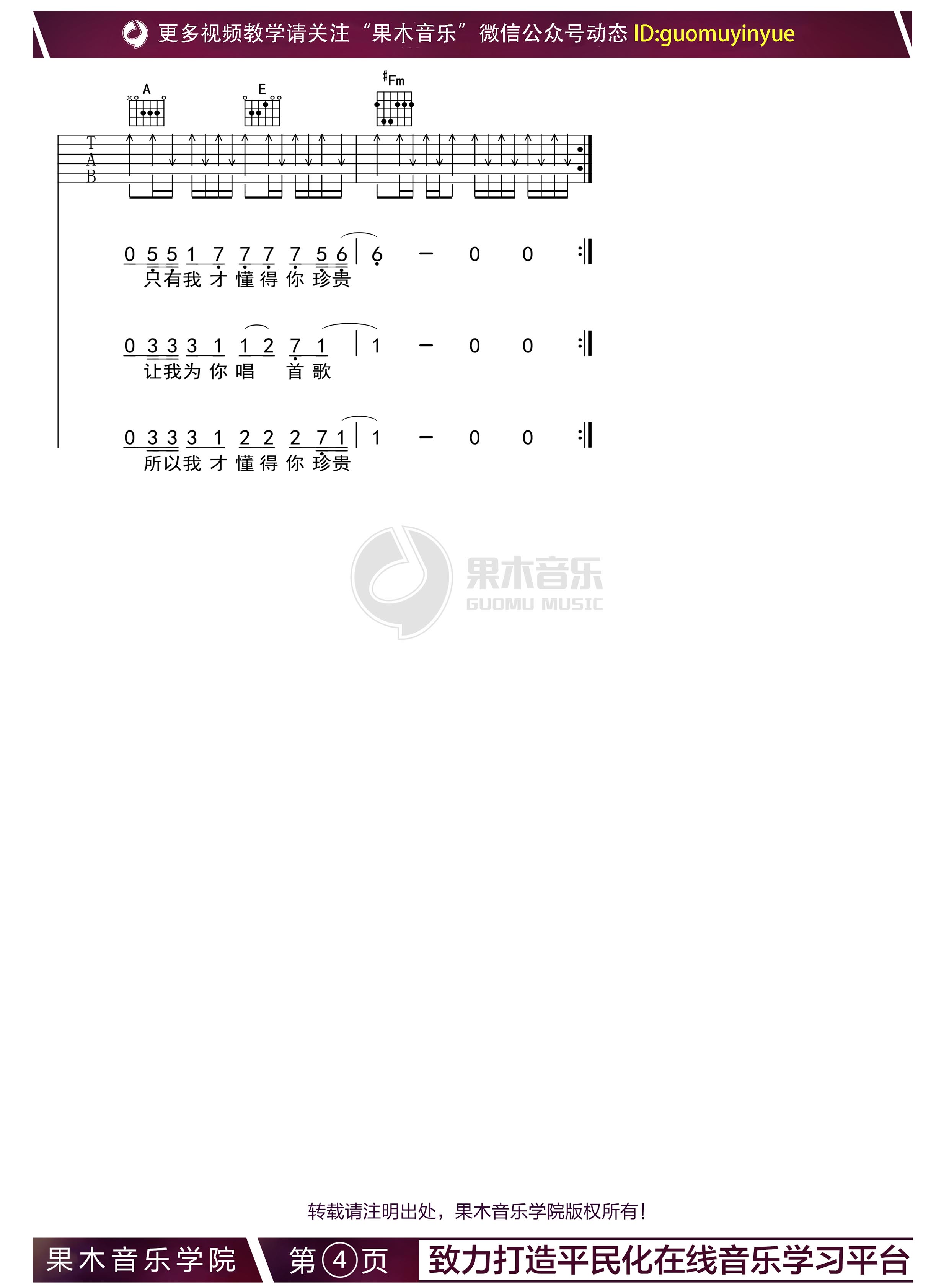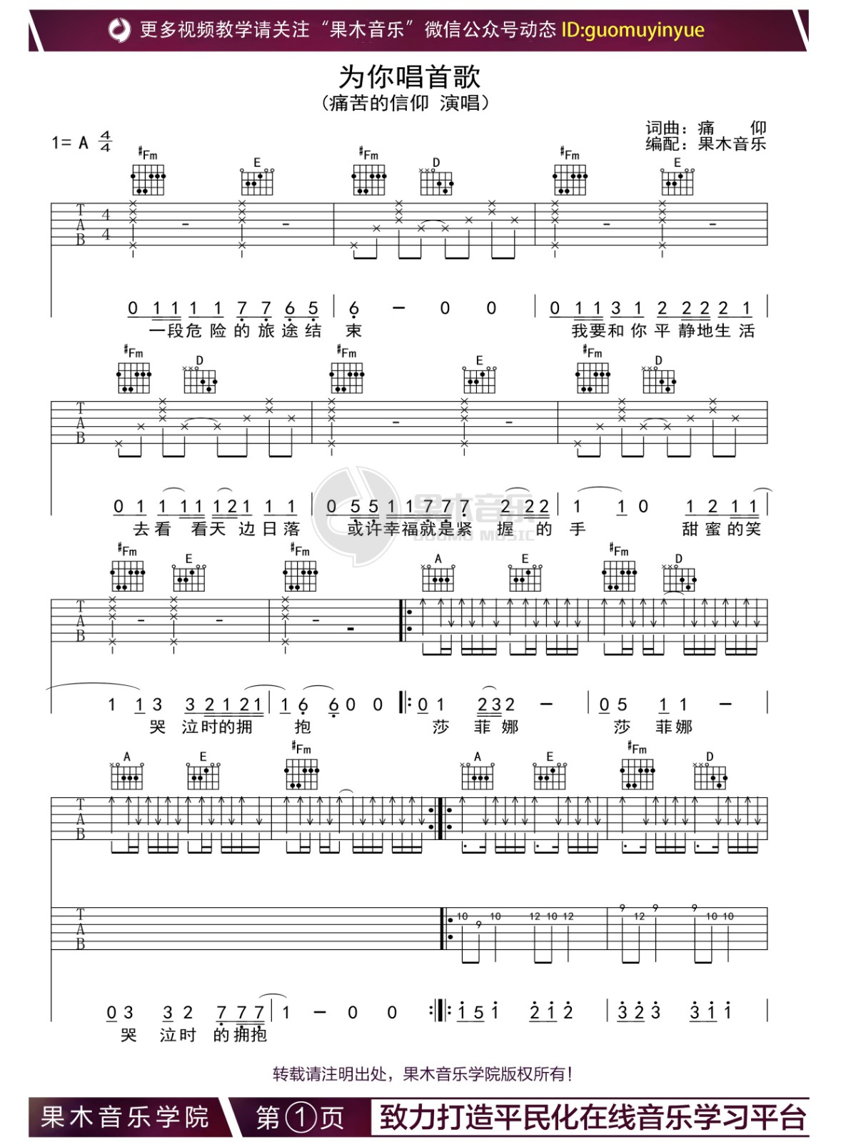 曲谱介绍: 《为你唱首歌》吉他谱,A调版吉他弹唱谱,来自果木音乐编配吉他六线谱,扫弦伴奏指法。 痛仰乐队《为你唱首歌》,歌曲有着经历生活历练后的平淡,超脱柔软。五彩斑斓的世界,每一个天使都热爱美丽,我懂得你珍贵。萨菲娜,你听见了吗?一段危险的旅途结束,我想要和你平静地生活。