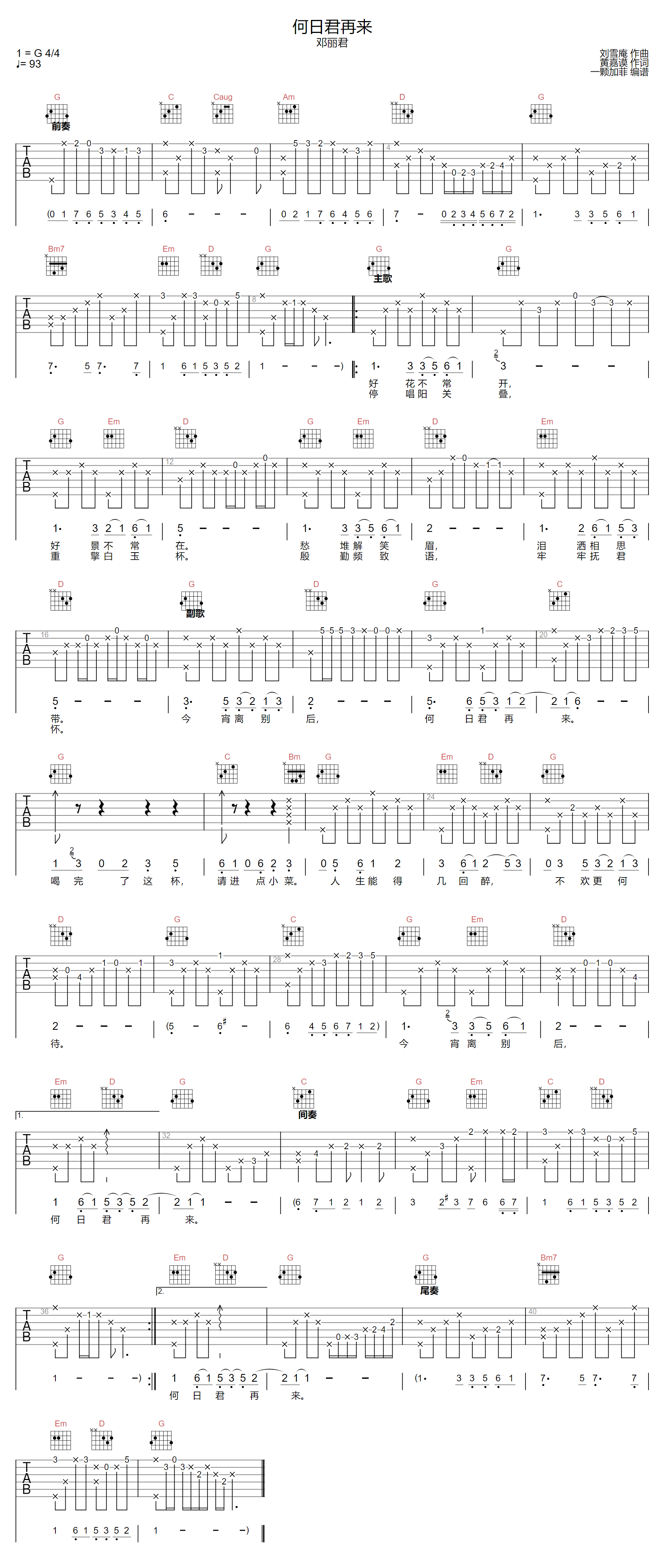 何日君再来吉他谱 - 邓丽君 - G调吉他弹唱谱 - 原版