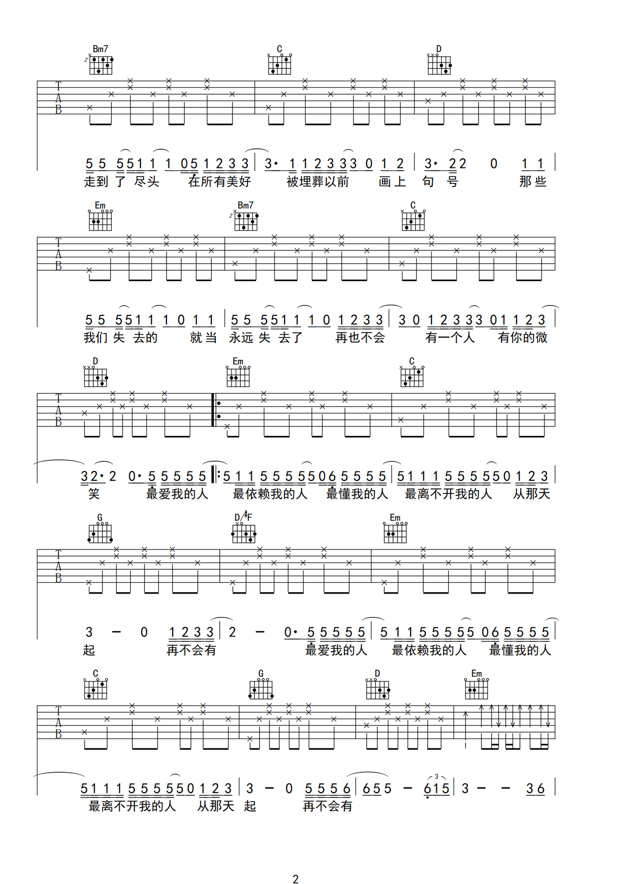 曲谱介绍: 杨和苏演唱的一首歌曲,4/4拍的节奏,这首歌曲的原调为降A调,这里曲谱采用了G调指法进行编配,演唱时夹变调夹1品可回到原调,也可根据个人实际嗓音情况选择。曲谱由琴谱网更新上传,曲谱来源于网络转载,编配制谱者暂不详。人的一生会有许多不同的阶段,时间也会慢慢筛选出身边的人,有些人可能只陪伴你走过一段旅程便离开了,那些日子或许不会再有,但刻骨铭心的回忆和痕迹永远不会被抹去…
